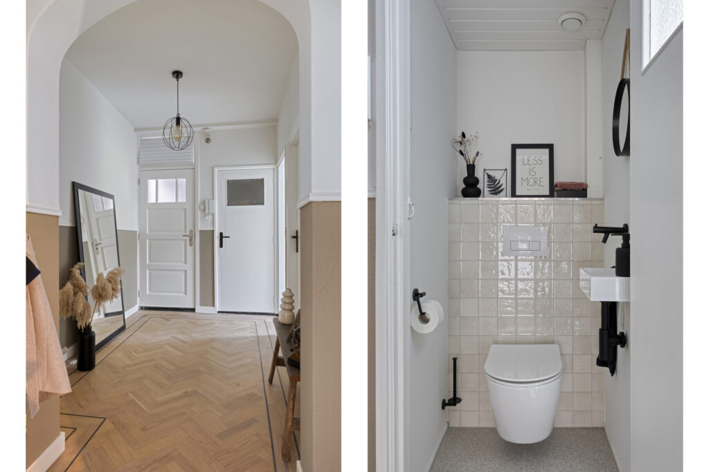 Afgewerkt met een klassieke visgraat parketvloer en voorzien van garderobe en intercom. De hal/entree biedt toegang tot:
