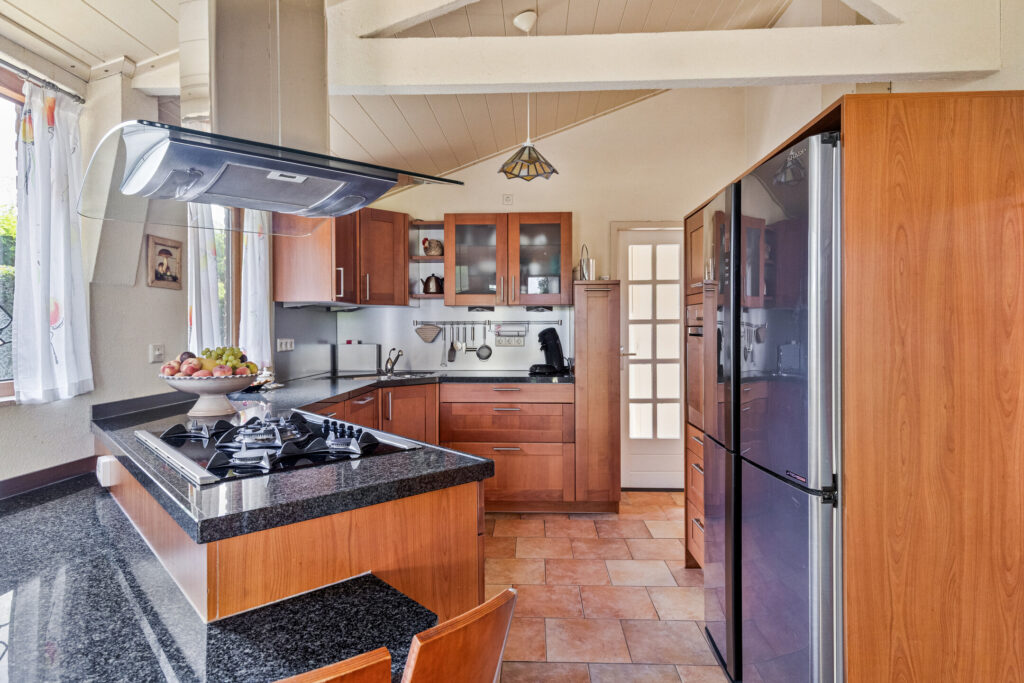 Entree/hal met vide, afgewerkt met een tegelvoer en schoonmetselwerk wanden en geeft toegang tot de woonkamer, de meterkast, het toilet, de garderobenis en de trapopgang naar de verdieping. De volledig betegelde toiletruimte is voorzien van en hangcloset en een fonteintje. De royale woonkamer voorzien van vloerverwarming en gashaard is ruim 40 m² groot, heeft veel lichtinval en biedt mooi uitzicht over de tuin en het groen. Middels een schuifpui is het terras te bereiken. De eetkeuken is voorzien van een keukeninrichting in U-opstelling met bar en diverse boven- en onderkasten. Aan inbouwapparatuur is aanwezig een oven, een koel-vries combinatie, een vaatwasser, een zwevende afzuigkap en een 5-pits gaskookplaat. Vanuit de keuken is er toegang tot de bijkeuken met aansluitingen wasapparatuur, kastruimte en loopdeur naar de tuin. De slaapkamer op de begane grond is toegankelijk vanuit de woonkamer en afgewerkt met een tegelvloer met vloerverwarming. Middels een schuifpui is er toegang tot de tuin. De badkamer en-suite is voorzien van een verzonken zitbad met douche, bidet, toilet en een badkamermeubel met spiegel.