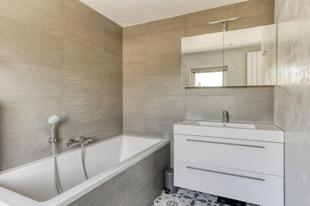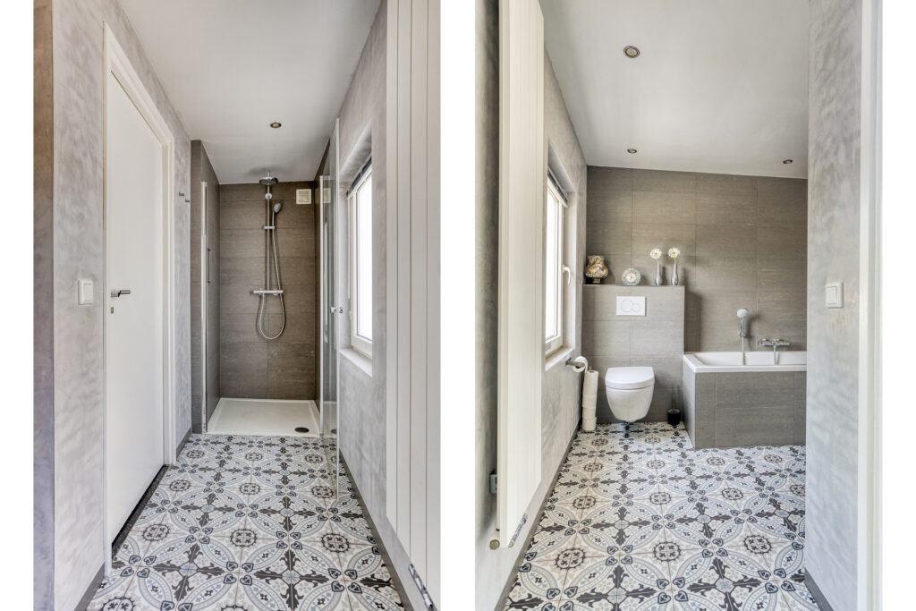 Luxe badkamer aan de voorzijde met fraaie Portugese tegelvloer. Aan sanitair is aanwezig: ligbad, wandcloset, badkamermeubel met wastafel, spiegel en kastruimte alsmede een inloopdouche voorzien van een regendouche, handdouche en glazen deur.