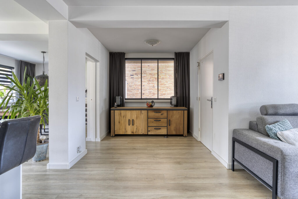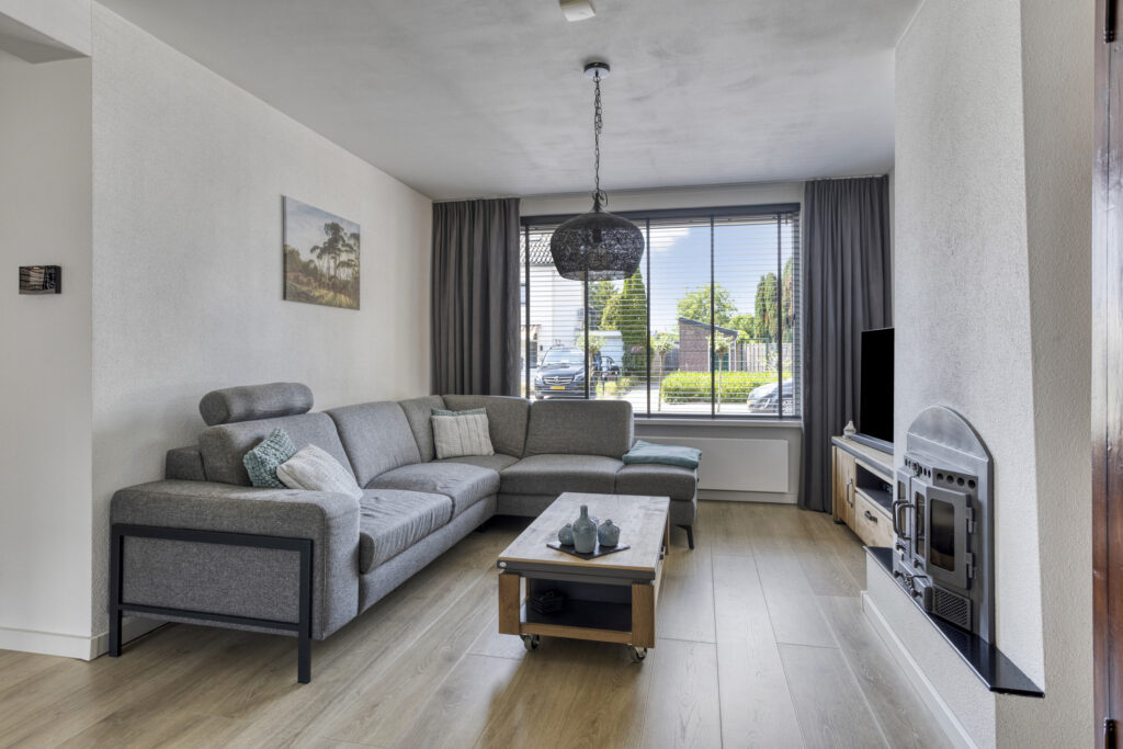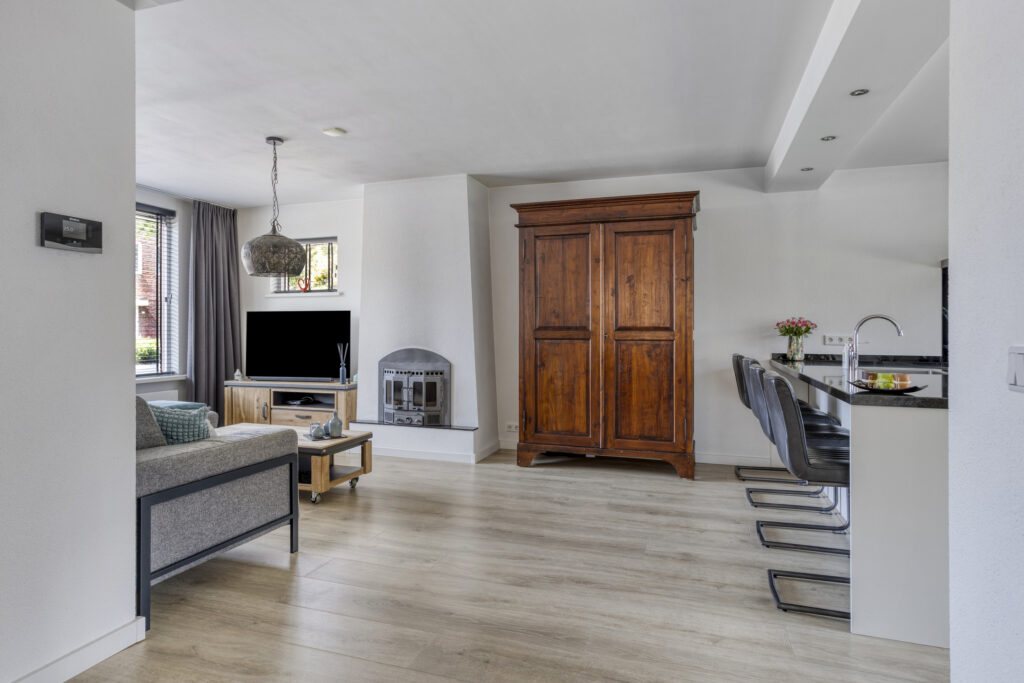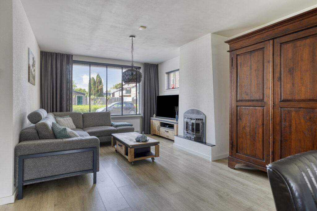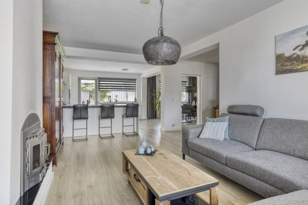 Royale L-woonkamer met laminaatvloer, sfeervolle inzethaard alsmede een open verbinding naar de eetkeuken. De woonkamer heeft veel natuurlijk lichtinval door de raampartijen langs 4-zijden.