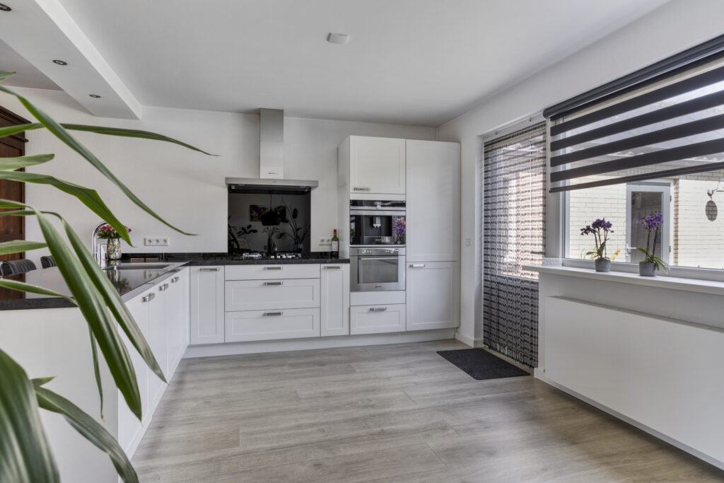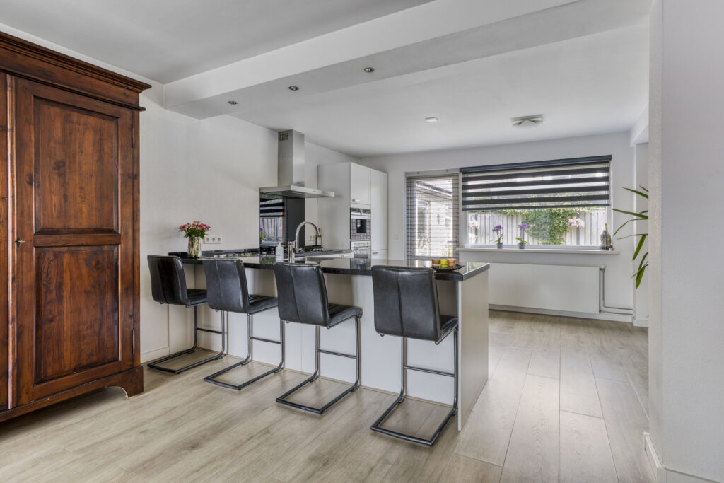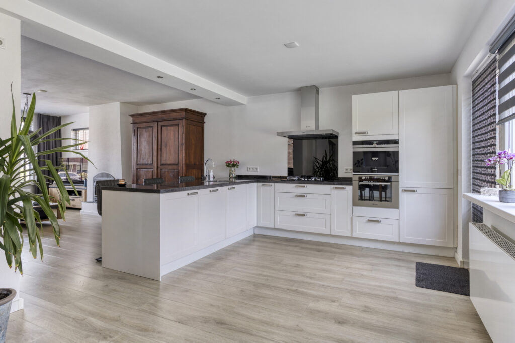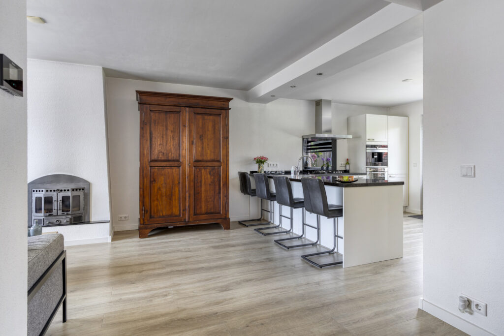 Royale eetkeuken (ca. 3.36m x 7.90m)met keukeninrichting in hoekopstelling met bargedeelte en een composiet aanrechtblad. Aan inbouwapparatuur is aanwezig: 4-pits gaskookplaat, afzuigkap, combi-magnetron/oven, koffiemachine, grote koelkast, vaatwasmachine en voldoende kastruimte. Vanuit de keuken is er toegang tot de tuin via een loopdeur.