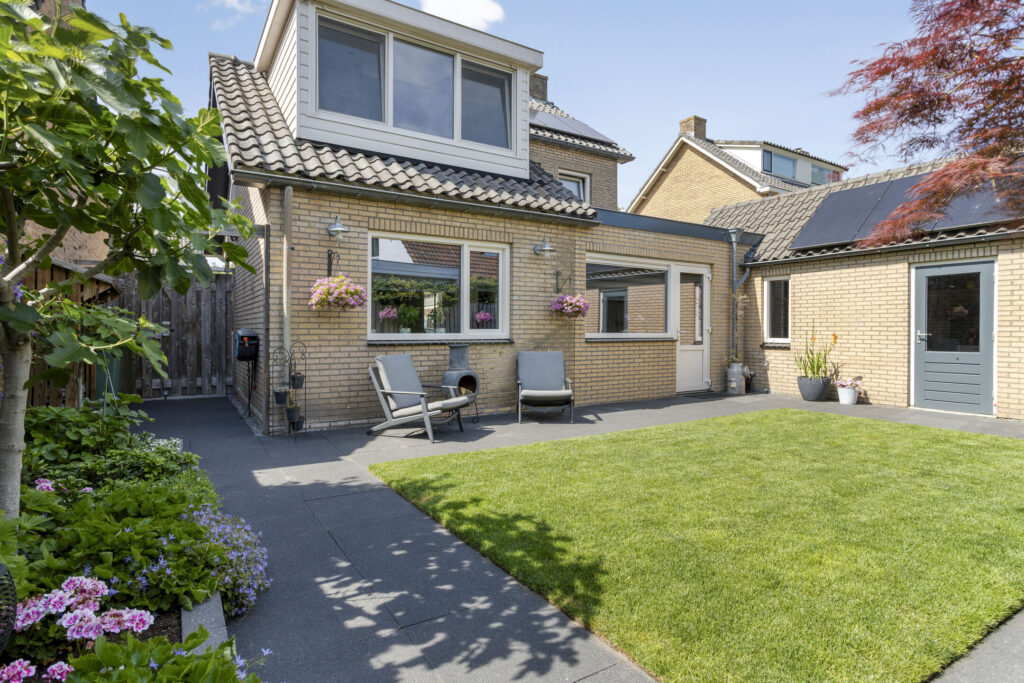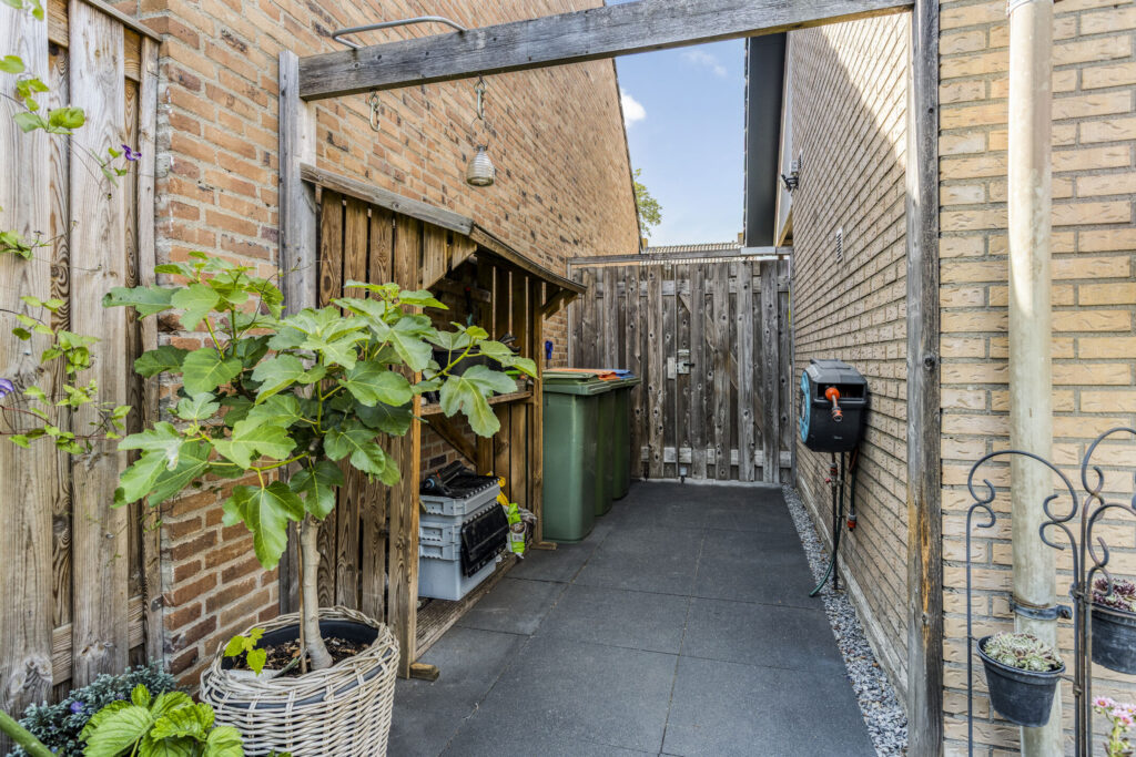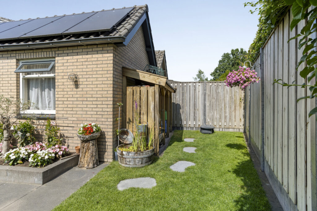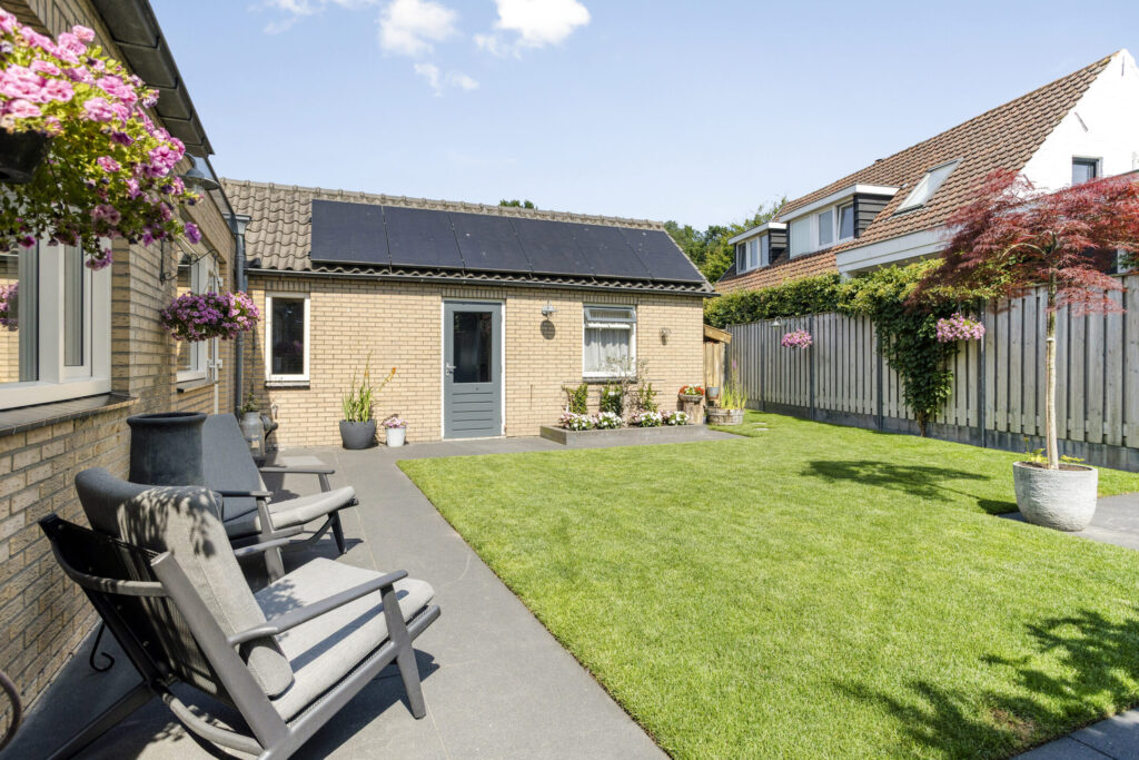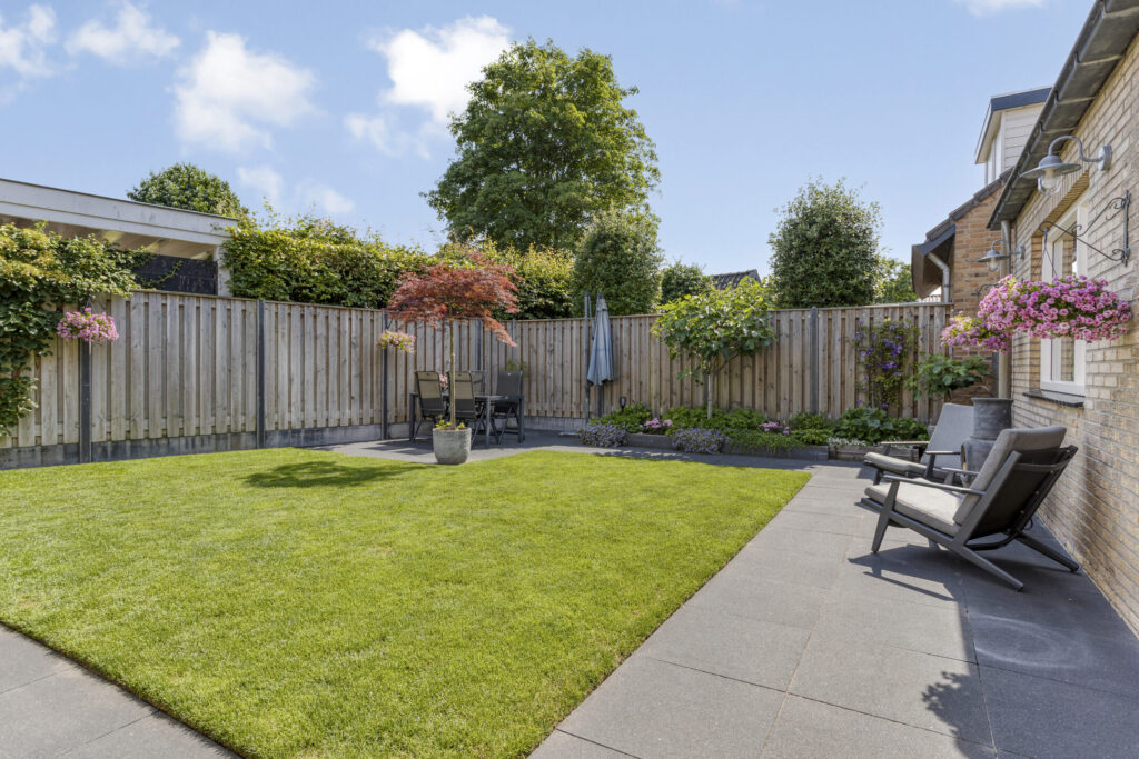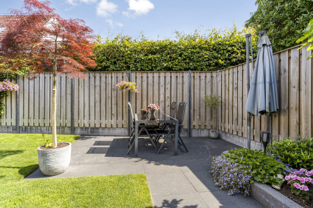 De woning heeft een verzorgde achtertuin op het zuidoosten. De tuin beschikt over terras met fraaie grote terrastegels en veel vast groen. Verder beschikt de tuin over degelijke erfafscheiding, een overkapping voor stookhout, een buitenkraan en buitenverlichting. Via een pad langs de woning met afsluitbare houten poort is er toegang tot de voorzijde van het perceel. De voortuin is verzorgd en onderhoudsvriendelijk ingericht met o.a. twee stenen plantenbakken.