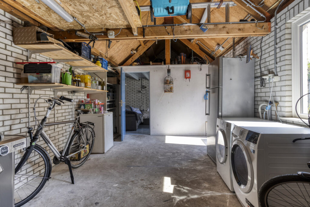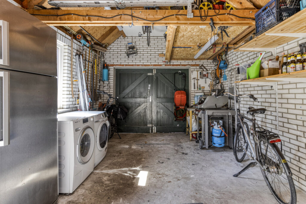 De garage gebouwd met spouwmuren en zadeldak is voorzien van elektra, betonvloer, wateraansluiting en een bergvliering onder de schuine kap. Tevens bevinden zich hier de aansluitingen ten behoeve van de wasapparatuur. In het achterste deel van de garage is een afzonderlijke ruimte/berging gecreëerd.
