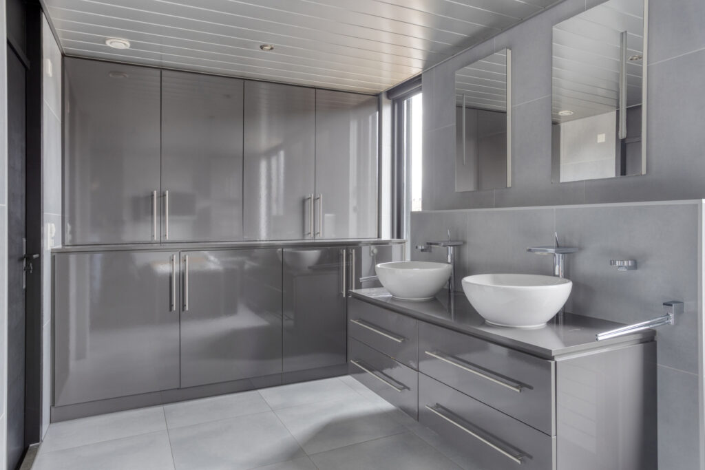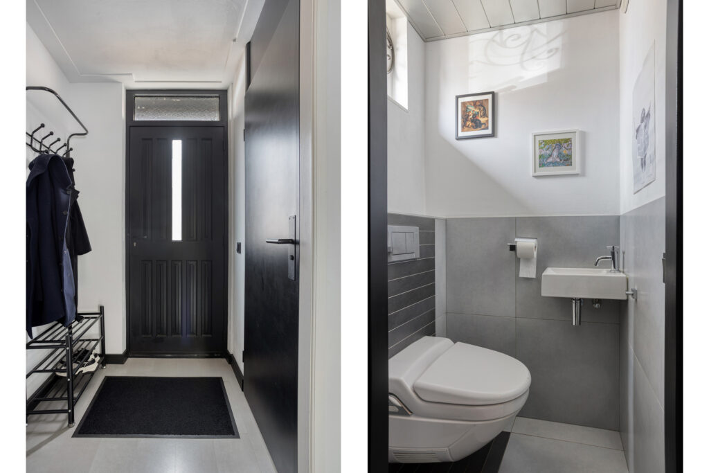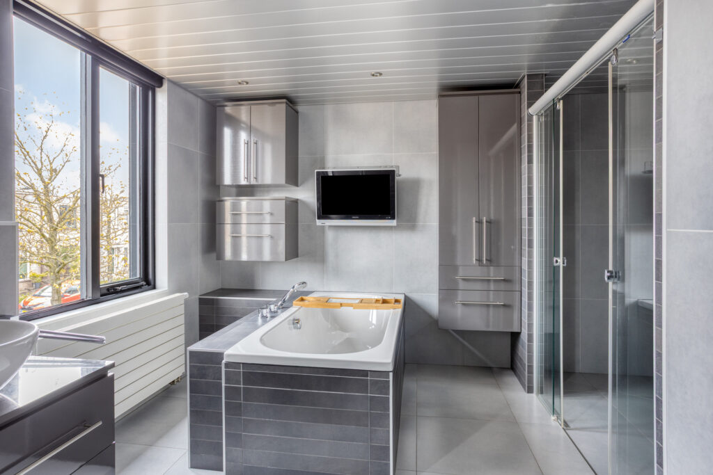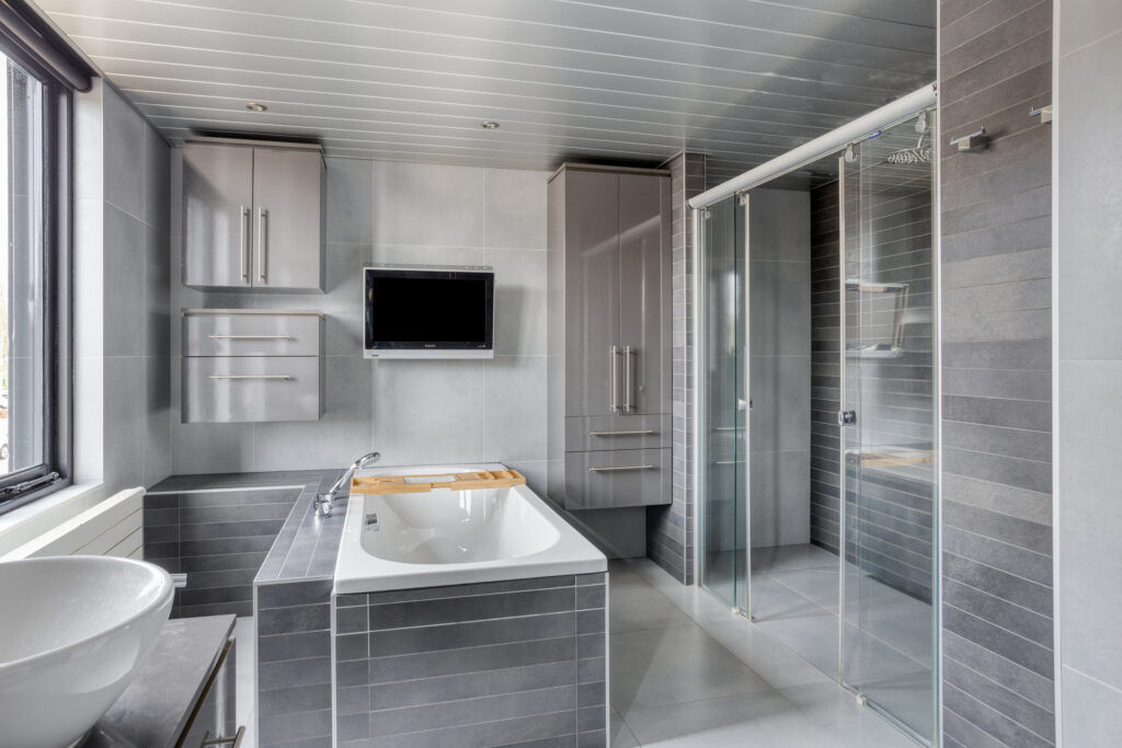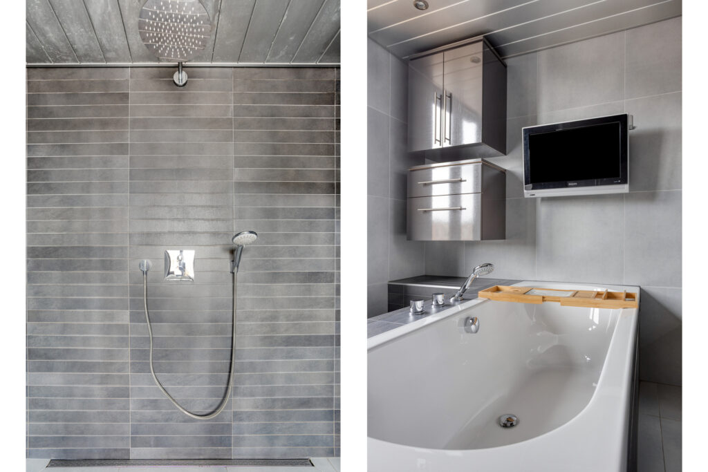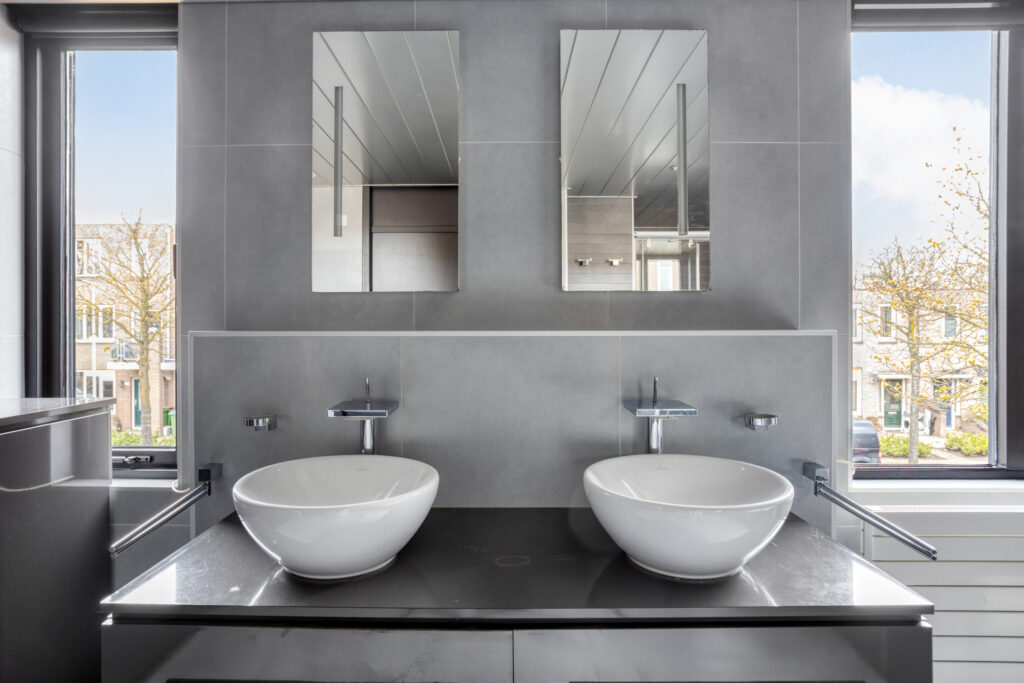 – Luxe, geheel betegelde badkamer gelegen aan de voorzijde voorzien van een wastafelmeubel met dubbele waskom, een zeer ruime inloopdouche met hand- en regendouche, groot ligbad, tv-aansluiting en vaste kastenwand met aansluitingen ten behoeve van de wasapparatuur.