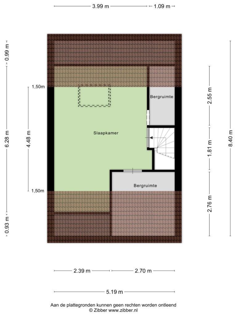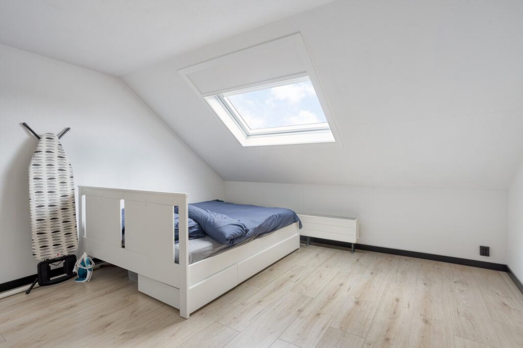 Slaapkamer II, voorzien van vloerbedekking, keurig afgetimmerd en voorzien van 2 bergkasten en groot Velux dakraam.