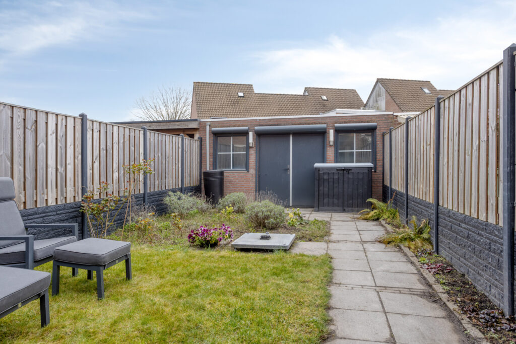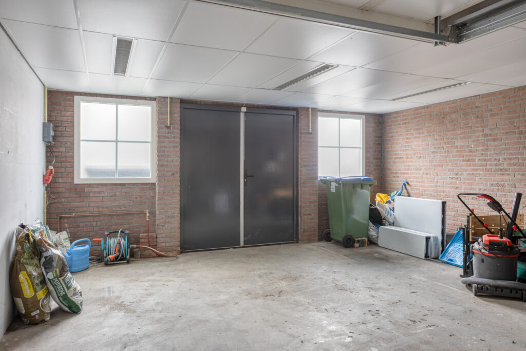 De tuin is gelegen op en zuidoosten, biedt veel privacy en is verzorgd aangelegd met sierbestrating, een gazon, degelijke erfafscheiding en diverse borders met vaste beplanting. Vanuit de tuin toegang tot de zeer ruime stenen garage. Deze ruime is voorzien een elektrische roldeur en heeft een wateraansluiting.