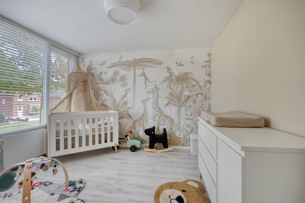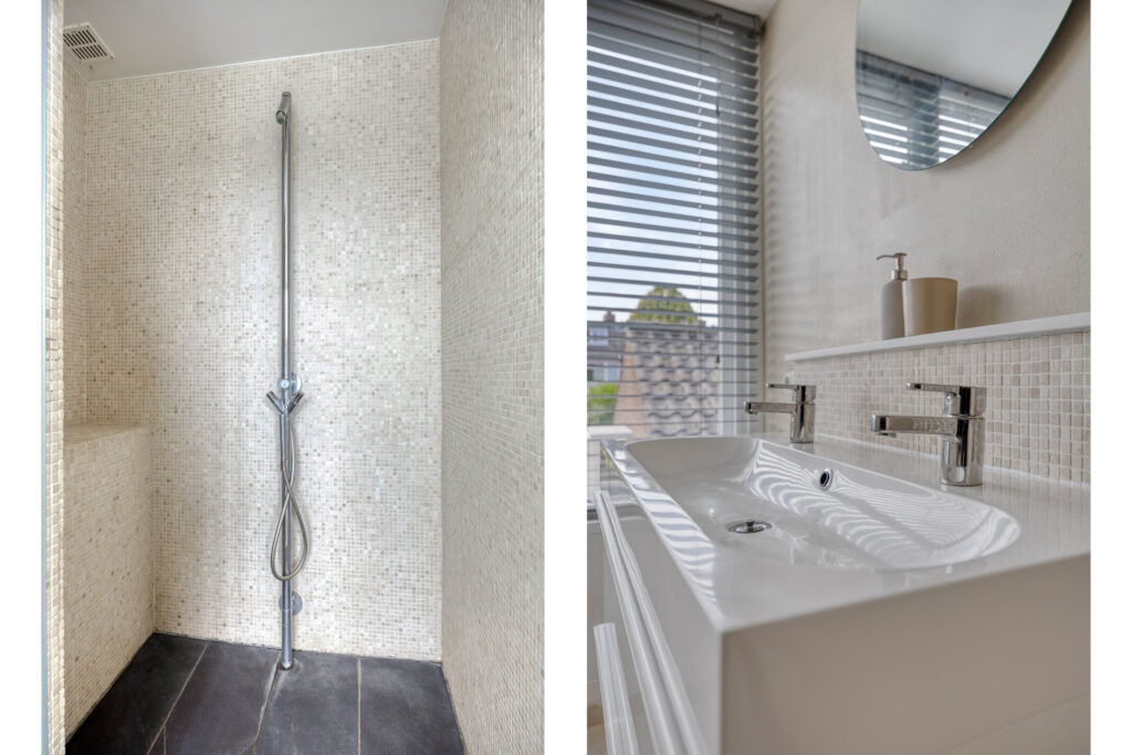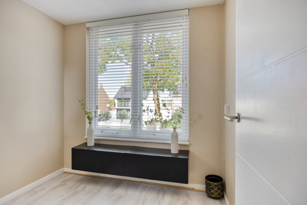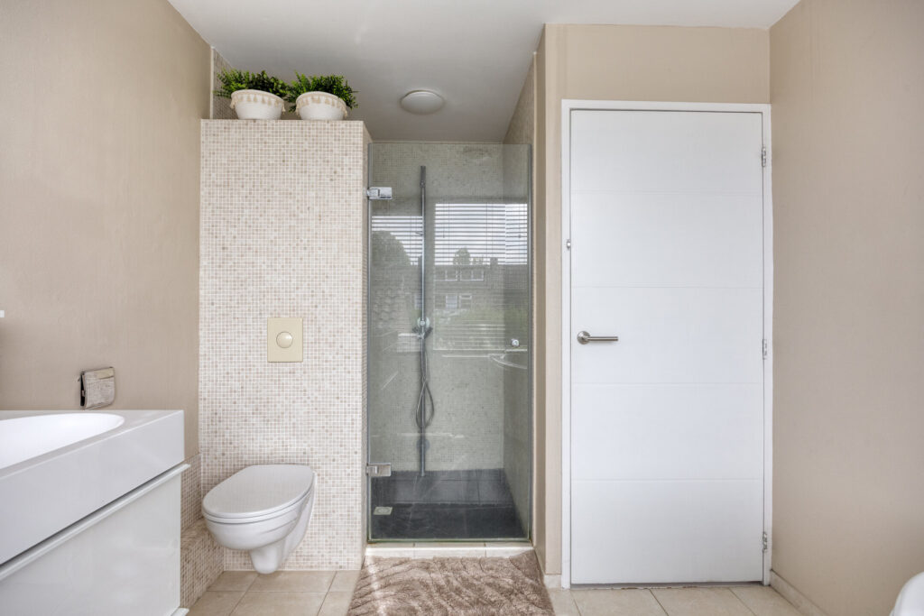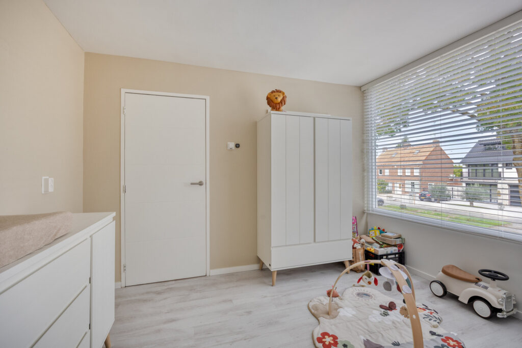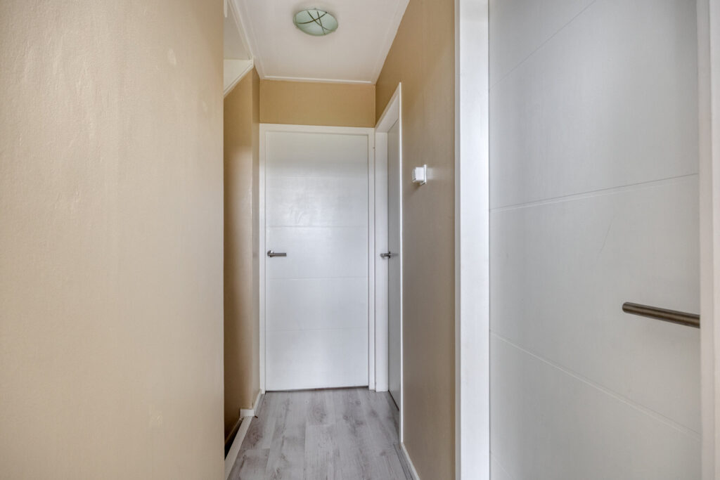 Overloop met toegang tot de twee slaapkamers en de badkamer; slaapkamer 1 (afm. ca. 3.41 x 3.49m) gelegen aan de voorzijde van de woning, slaapkamer 2 (afm. ca. 3.93 x 3.49m) gelegen aan de achterzijde van de woning; de derde kamer aan de voorzijde is voorzien van de trapopgang naar de tweede verdieping; de luxe en volledig betegelde badkamer (afm. ca. 3.96 x 2.44m) is gelegen aan de achterzijde en voorzien van een inloopdouche met regen- en handdouche, groot wastafelmeubel met dubbele kraan en tweede toilet. Tevens zijn er inbouwspots en mechanische ventilatie aanwezig. De vloeren op de overloop en de slaapkamers zijn afgewerkt met een laminaatvloer en stucwerk wandafwerking.