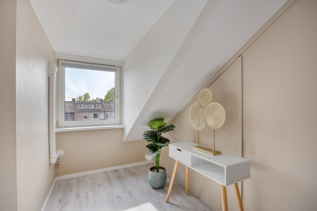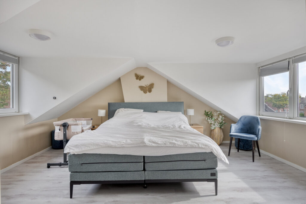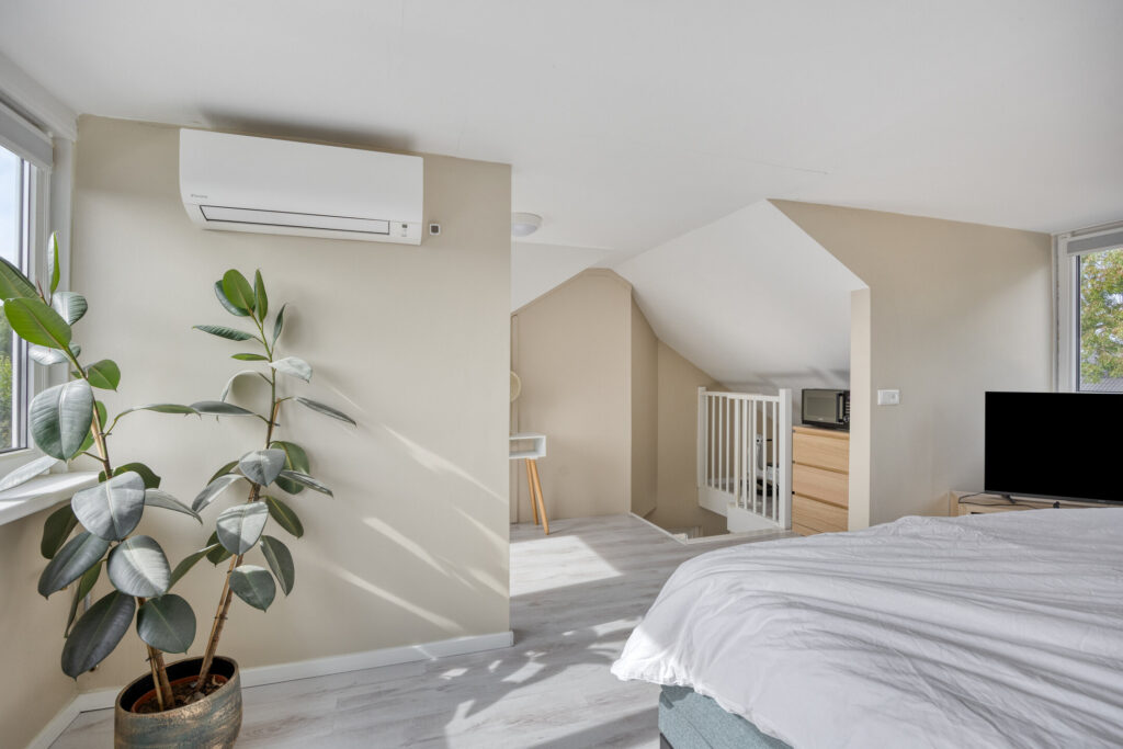 Middels een vaste trap is de fraaie zolderkamer te bereiken waar zich de CV-opstelling (Remeha bj. 2022) zich bevindt (weggewerkt). Deze ruimte is voorzien van een dakkapel aan de voor- en achterzijde en airconditioning.