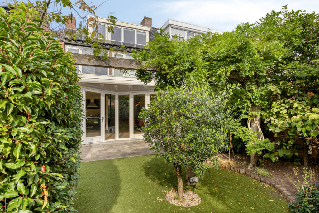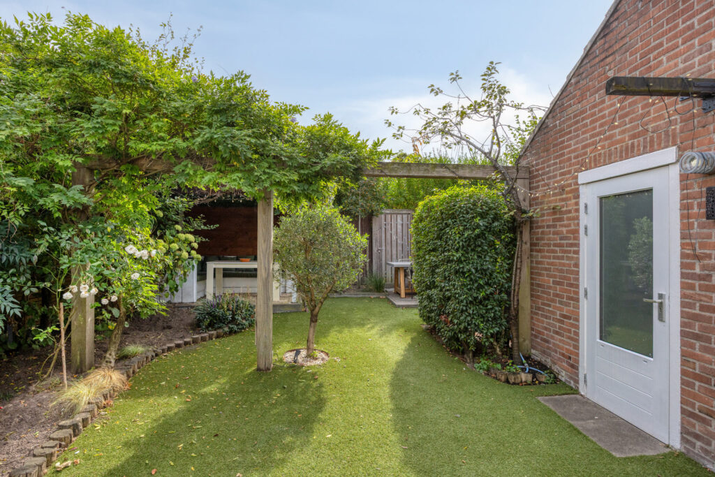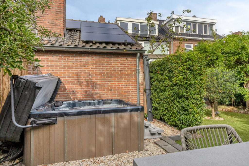 Fraai aangelegde voortuin voorzien van volwassen beplanting, waterkraan en oprit met ruimte voor 2 auto’s. De onder architectuur aangelegde achtertuin is fraai ingericht en o.a. voorzien van meerdere terrassen, volwassen beplanting, overkapping, zonnescherm (doek vervangen in 2024), jacuzzi en een buitendouche met zonneboiler.