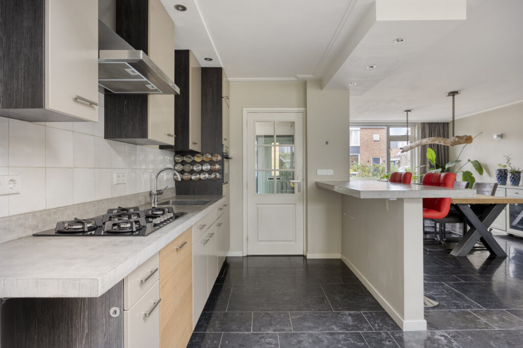 Entree met toegang tot de moderne meterkast, de trapkast, de trapopgang en toiletruimte voorzien van een hangcloset en een fonteintje. De royale woonkamer is onderverdeeld in een zitgedeelte, eetgedeelte met open keuken. Aan de achterzijde is woning fors uitgebouwd en heeft veel lichtinval door de grote raampartijen en de lichtstraat. Via een schuifpui is de veranda/overkapping te bereiken. De open keuken in rechte opstelling is uitgevoerd met met diverse boven- en onderkasten. Aan inbouwapparatuur is aanwezig: gaskookplaat, afzuigkap, vaatwasser, combi oven-magnetron en koelkast. Via een loopdeur is er doorgang naar de garage.