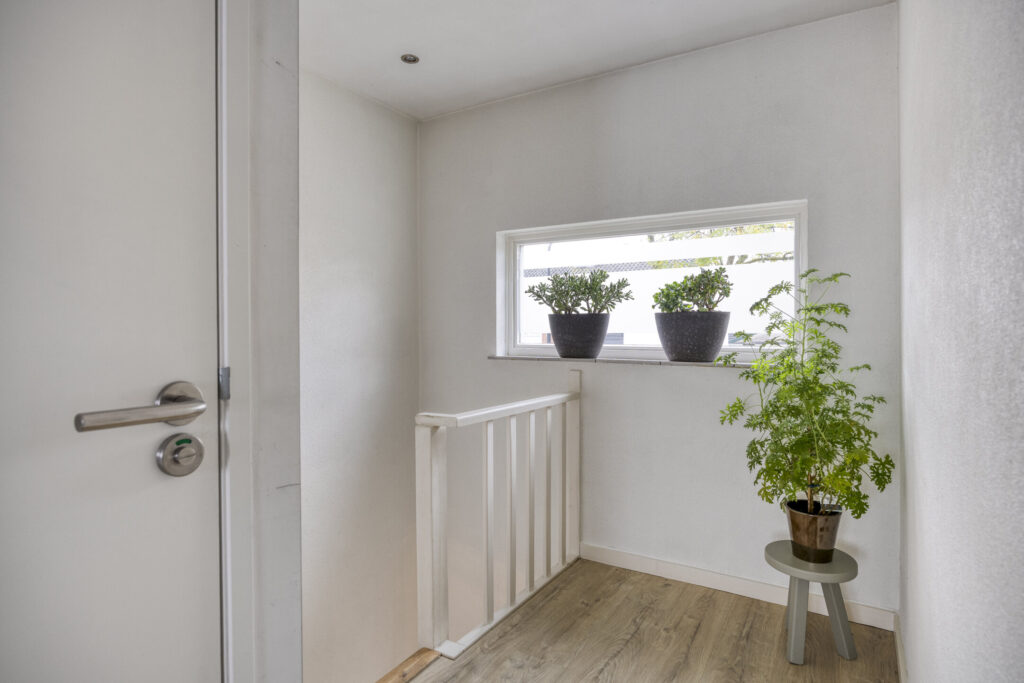 Overloop met toegang tot 2 slaapkamers, de badkamer, separaat toilet en de vlizotrap naar de zolder.