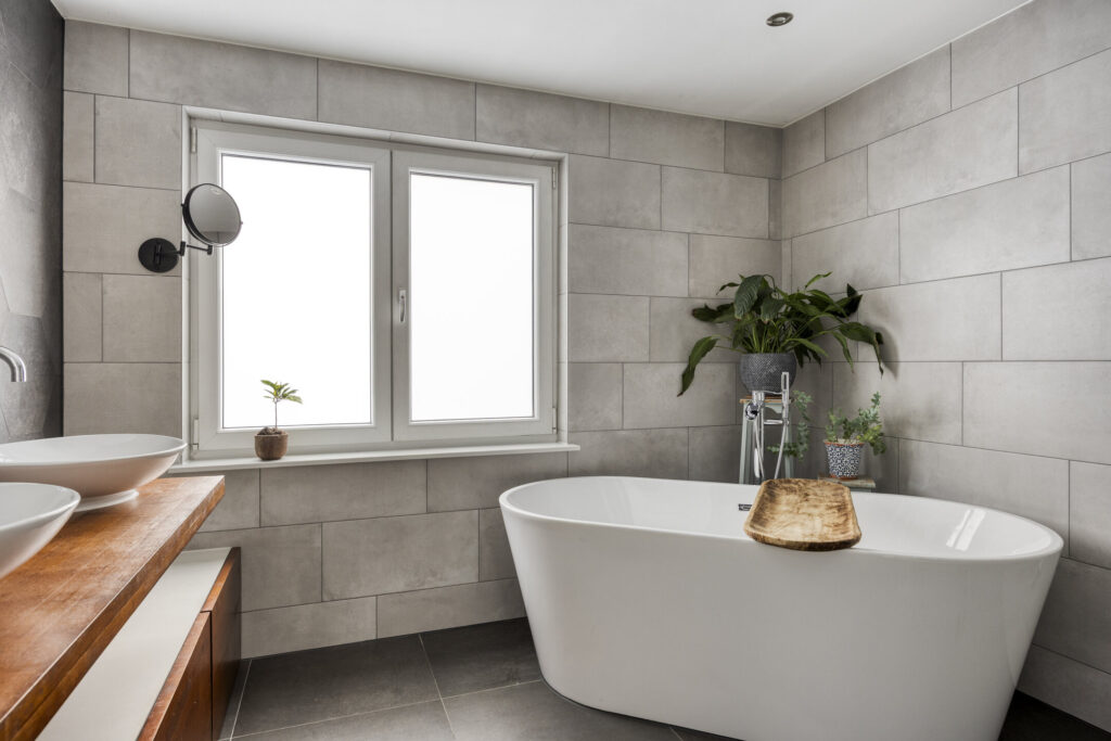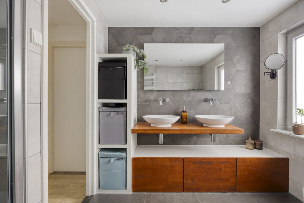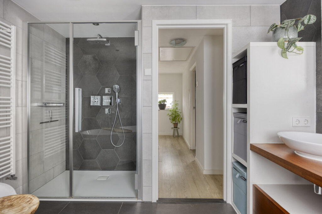 – Geheel betegelde, moderne badkamer (2018) met vloerverwarming voorzien van; vrijstaand ligbad, douche met regen- en handdouche, badkamermeubel met dubbele waskom en spiegel met verlichting;