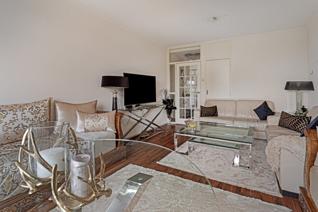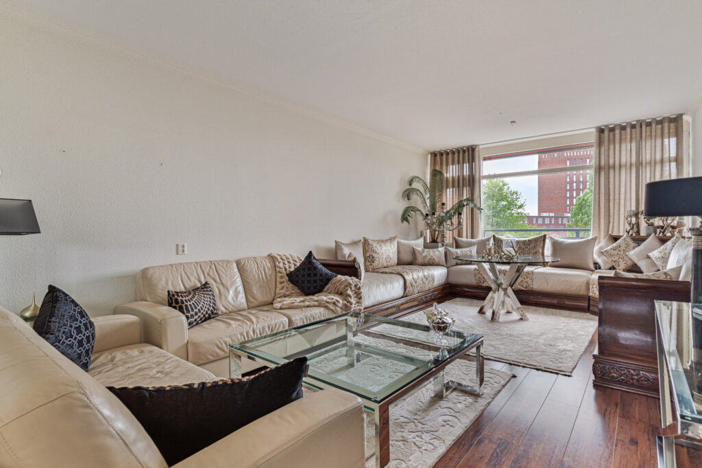 Entree/hal met intercom/videofoon, toegang tot de keuken, woonkamer en overige vertrekken. Ruime keuken aan de galerijzijde (circa 2.42 x 3.34 m) met een keukenblok in hoekopstelling met diverse boven- en onderkasten. Aan inbouwapparatuur is aanwezig: keramische kookplaat, afzuigkap, oven en magnetron. In een keukenkastje is de CV-combiketel verwerkt, verder is er een praktische voorraadkast. De woonkamer is gelegen aan de voorzijde van het complex en voorzien van een laminaat vloer en deur naar het zonnige balkon. Vanuit de hal is er toegang tot de 2 vaste inbouwkasten, de twee slaapkamers aan de galerijzijde ( 2x circa 1.94 x 2.85 m), de toilet, de ruime bergkast, de badkamer en de derde slaapkamer/master bedroom. De moderne badkamer (circa 1.89 x 2.01 m) is geheel betegeld en heeft een Whirpool ligbad met douche en een wastafelmeubel met spiegel. De toiletruimte is half betegeld en voorzien van een staand toilet en fonteintje. De master bedroom (circa 3.65 x 3.65 m) is gelegen aan de voorzijde en biedt toegang tot het balkon.