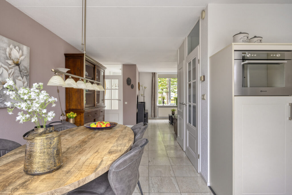 Entree/hal met toegang tot de woonkamer en de vaste kast met meterkast en unit stadsverwarming. De royale L- woonkamer is ca. 35 m² groot, heeft veel lichtinval en biedt mooi uitzicht over de tuin en het speelveld aan de voorzijde. De open keuken is gelegen aan de achterzijde en is voorzien van een keukeninrichting in hoekopstelling met diverse boven- en onderkasten. Aan inbouwapparatuur is aanwezig een inductie kookplaat, afzuigkap, combi oven en koelkast. Er is ruimte voor een vaatwasmachine. Vanuit de keuken is er toegang tot de tuin en de veranda. Vanuit de woonkamer is de tussenhal bereikbaar, hier bevindt zich de toiletruimte met fonteintje en de trapopgang naar de 1e verdieping.