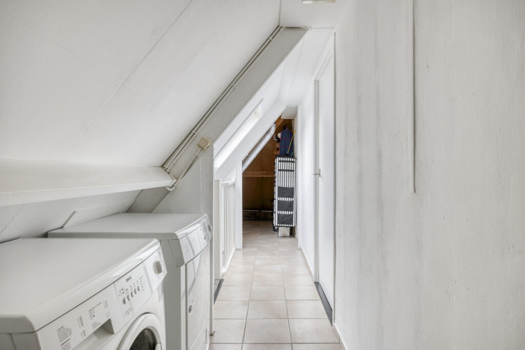 Ruime voorzolder met kunststof Velux dakraam en aansluitingen voor was- en droogapparatuur.