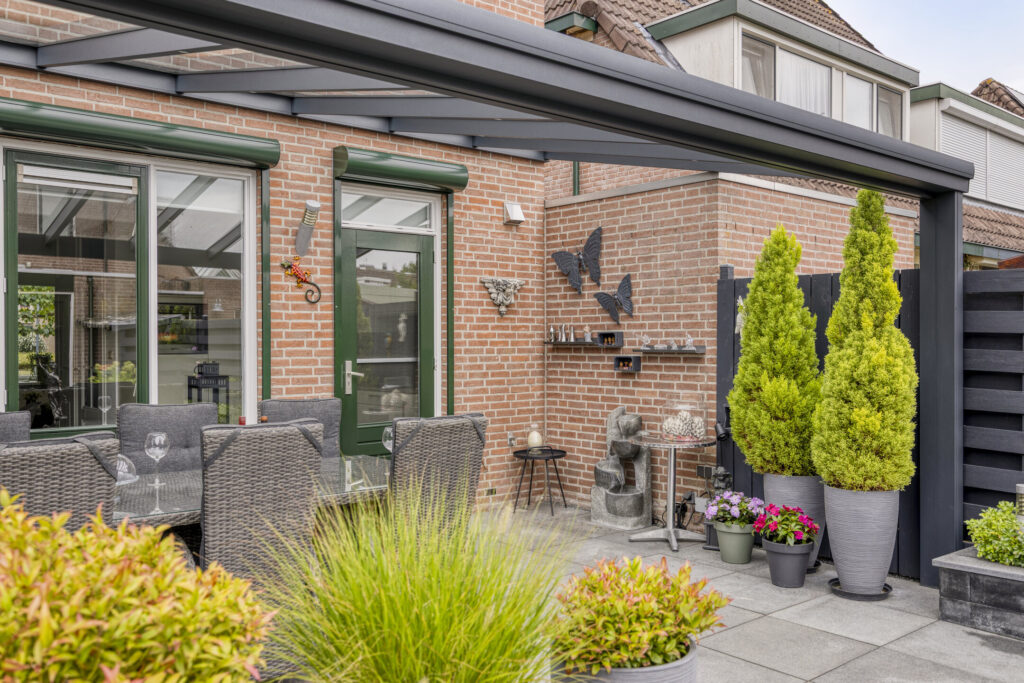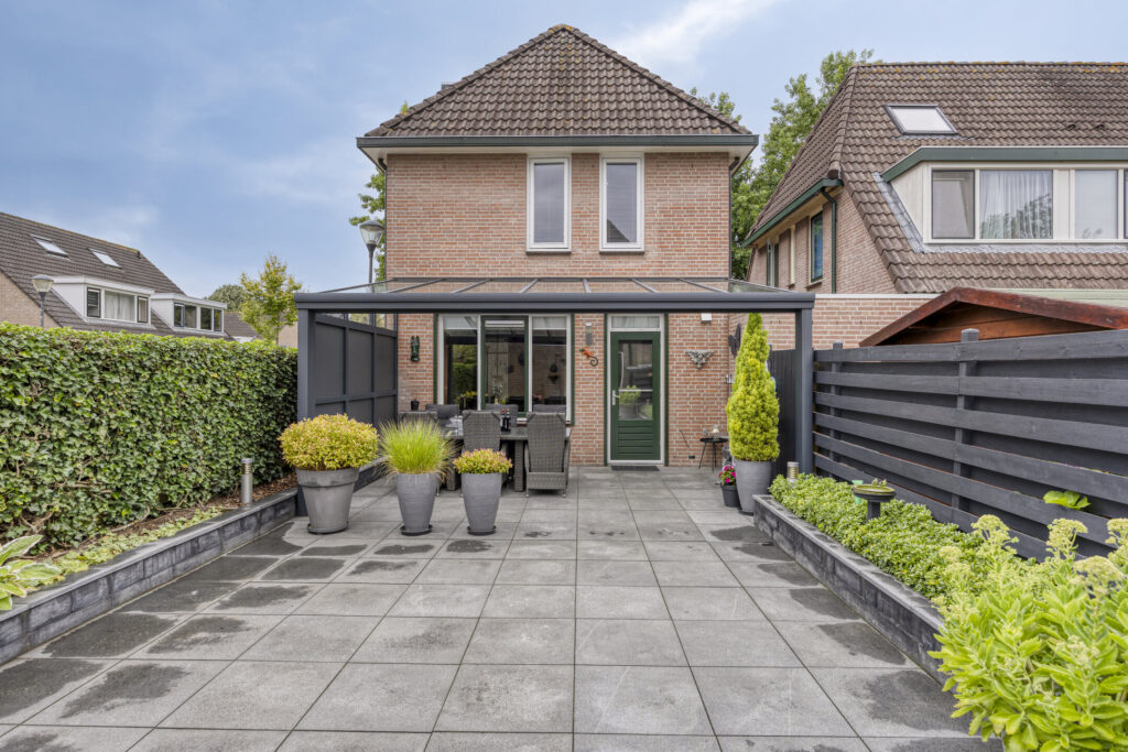 De achtertuin is ca. 10m diep en is gelegen op het zuidoosten. De tuin is fraai ingericht met een veranda, grote terrastegels, borders met vast groen en degelijke erfafscheiding. Verder heeft de tuin buitenverlichting, een buitenkraan, een overkapping voor afvalcontainers en een drainagesysteem voor soepele afwatering. De fraaie aluminium veranda (Pallazzo) is uitgevoerd met verlichting en heeft de mogelijkheid voor het plaatsen van harmonicadeuren. Middels een poort is er toegang tot de straatzijde. De voortuin is eveneens verzorgd ingericht met vast groen en is omheind met een laag stalen hekwerk.
