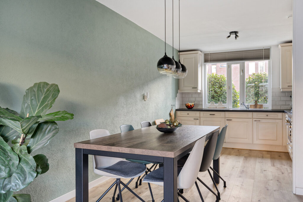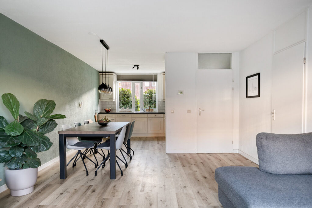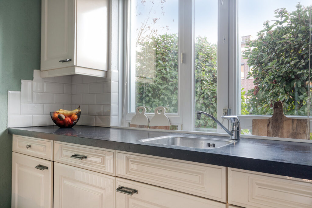 De ruime en tuingerichte woonkamer beschikt over een vaste kast onder de trap met veel opbergruimte. Vanuit de woonkamer is middels een loopdeur de achtertuin bereikbaar. Open hoekkeuken gelegen aan de voorzijde van de woning. Deze keuken is o.a. voorzien van een natuurstenen werkblad, 4-pits gaskookplaat, ingebouwde afzuigkap, vaatwasmachine, combi-oven, koelkast en vrieslades. Tevens treft u hier veel opbergruimte aan in de onder- en bovenkastjes.