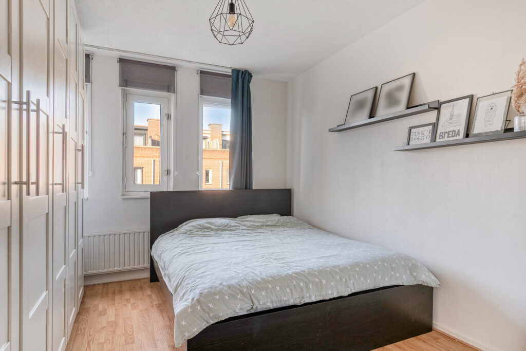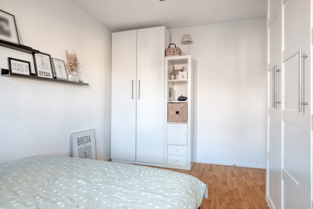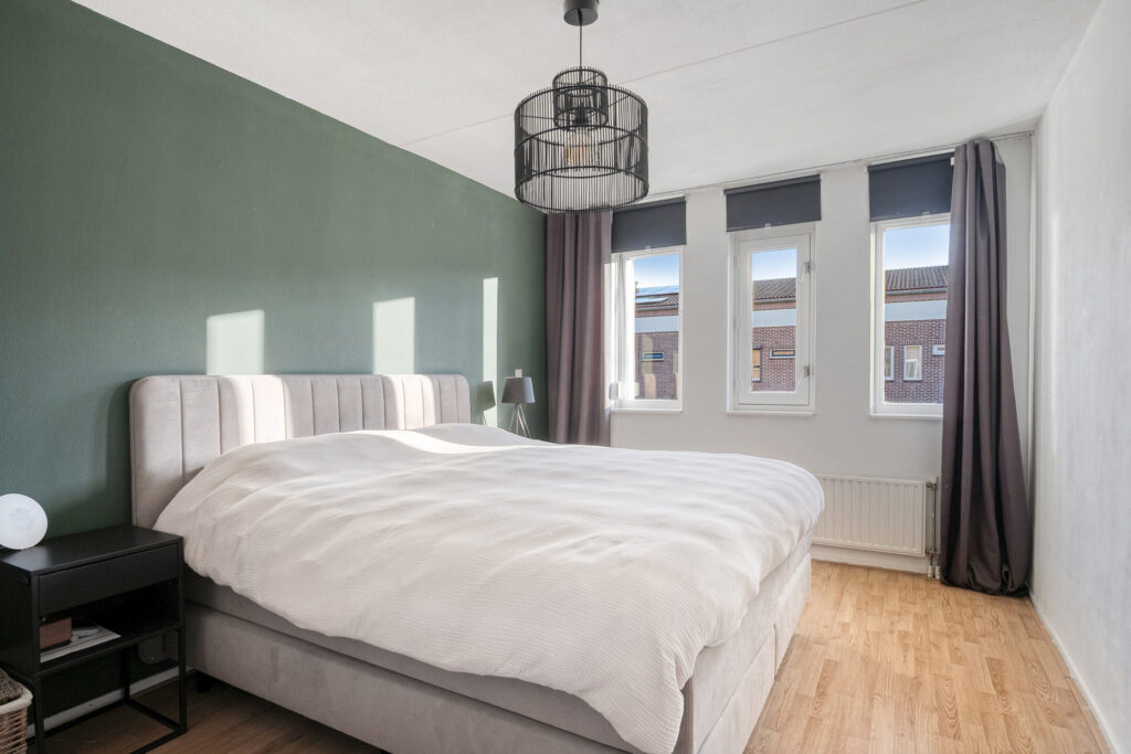 Ruime slaapkamer IV voorzien van een laminaatvloer en een grote raampartij met elektrisch rolluik.