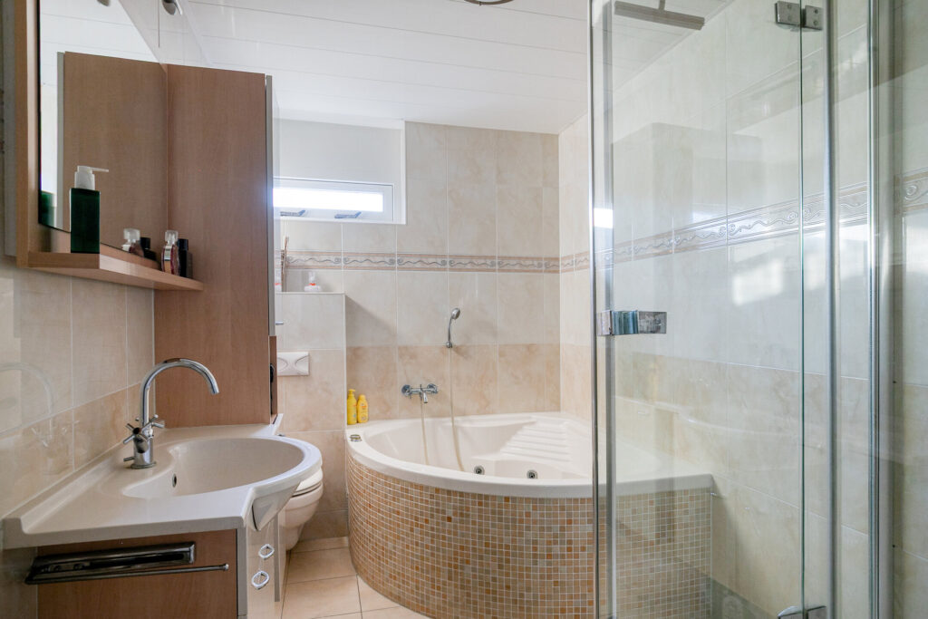 Alle slaapkamers en de overloop zijn voorzien van een laminaatvloer en alle slaapkamers zijn voorzien van rolluiken. Slaapkamer I gelegen aan de achterzijde van de woning; Ruime slaapkamer II gelegen aan de achterzijde van de woning; Riante ouderslaapkamer III gelegen aan de voorzijde van de woning. Volledig betegelde badkamer gelegen aan de voorzijde van de woning hier treft u een hoekbad met jets, douche, hangend closet en een wastafelmeubel.