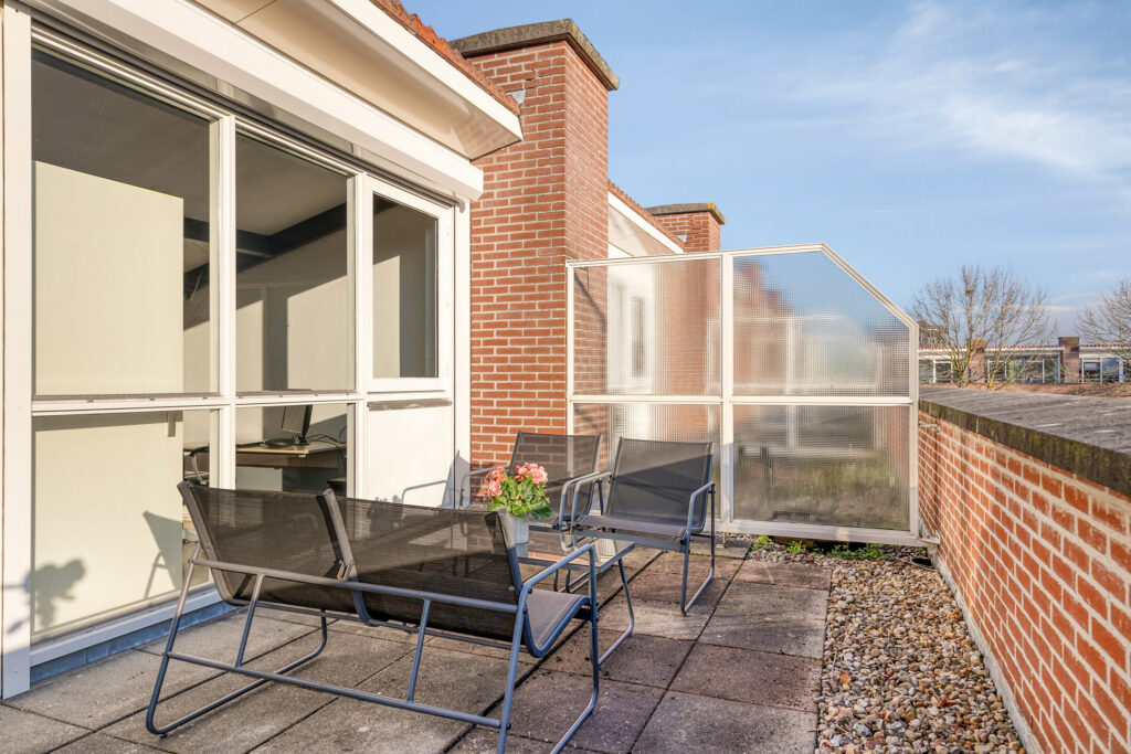 Zonnig en riant dakterras gelegen aan de voorzijde van de woning, welke voorzien is van tegels en kiezelstenen. Een plek waar je op een zonnige dag heerlijk van de zon kunt genieten.
