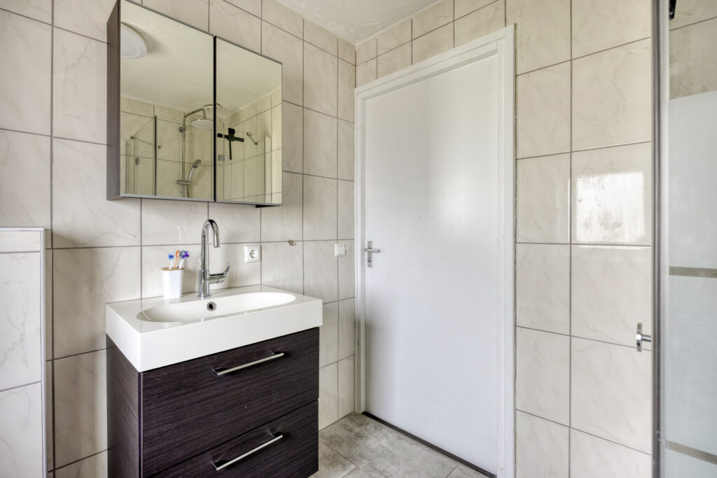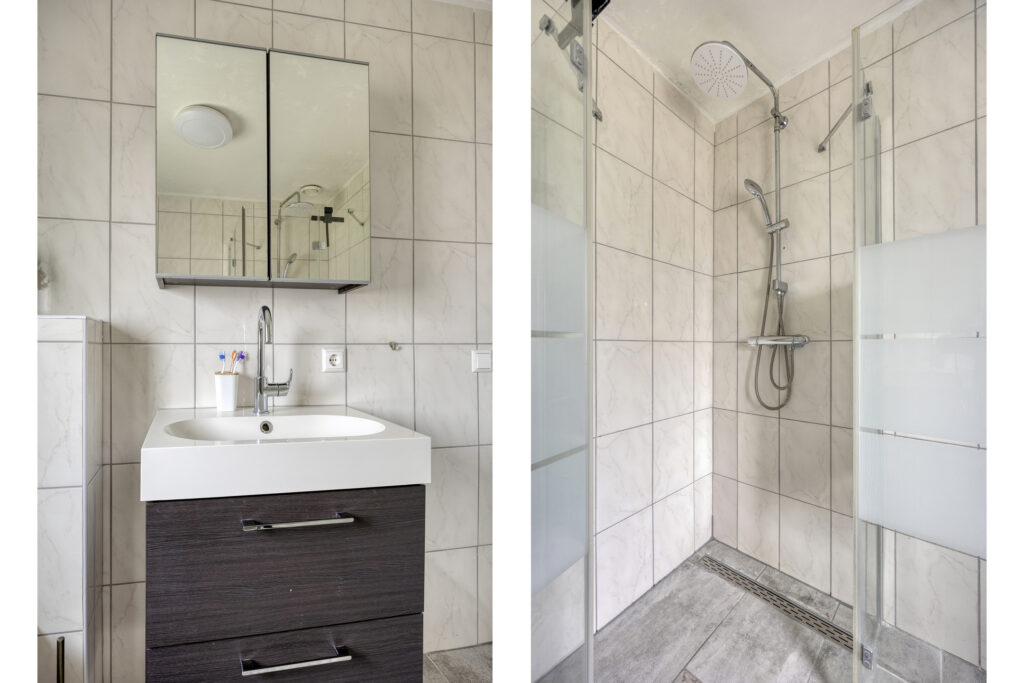 – Badkamer (2019), gelegen aan de voorzijde, gedeeltelijk betegeld, met inloopdouche, hangend toilet, wastafel in meubel, radiator en aansluiting voor wasapparatuur.