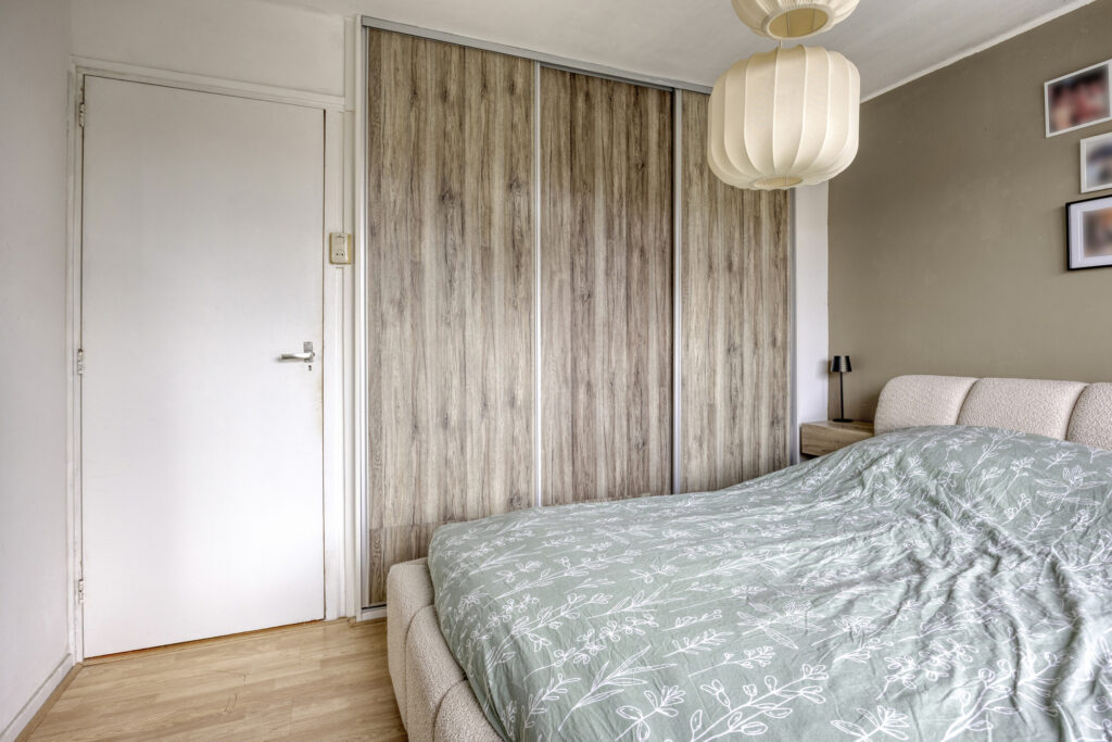 – Slaapkamer I, gelegen aan de achterzijde, met laminaatvloer, stucwerk wandafwerking en voorzien van een vaste inbouwkast;