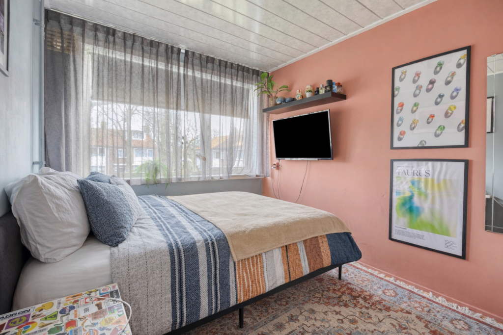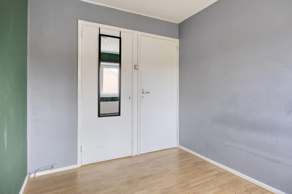– Slaapkamer II, gelegen aan de achterzijde, met een laminaatvloer, stucwerk wandafwerking en een vaste schuifkastenwand;