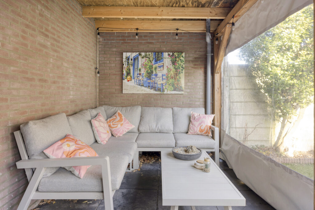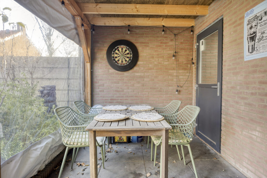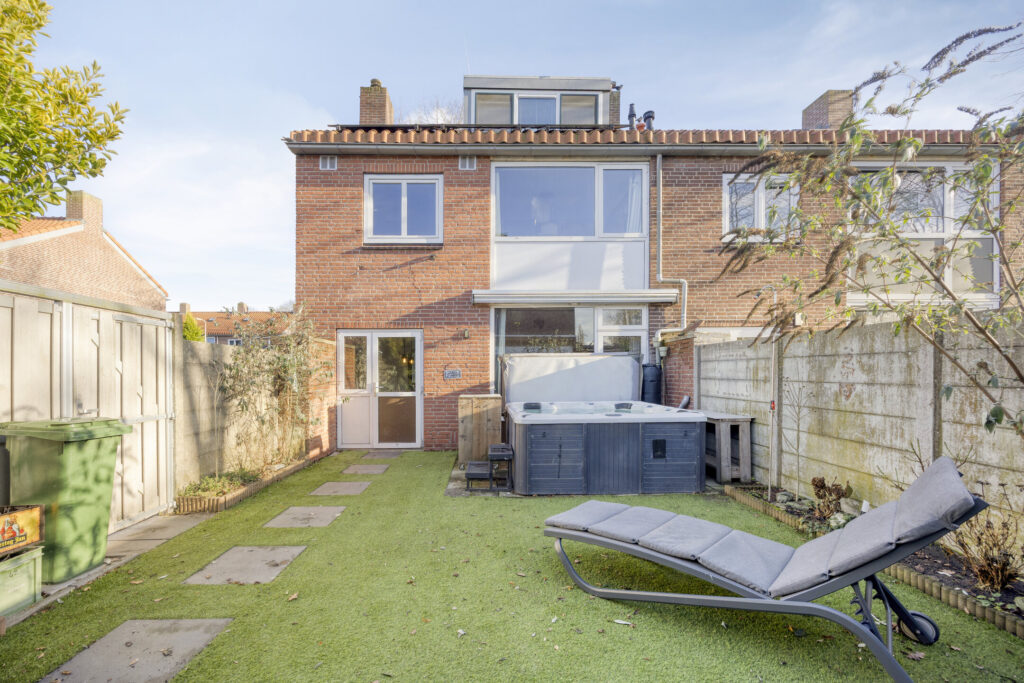 De achtertuin is gelegen op het zonnige westen en is opnieuw aangelegd met sierbestrating, borders met beplanting en kunststof gazon. De achtergevel is voorzien van een handbedienbaar zonnescherm. Via een poort is er toegang tot de straat. De ruime overkapping is voorzien van elektra en biedt toegang tot de garage evenals de berging. Via een dubbele deur is de garage te bereiken met betonvloer, elektrische roldeur, lichtkoepel en elektra. De berging is eveneens voorzien elektra. De jacuzzi is beschikbaar ter overname.