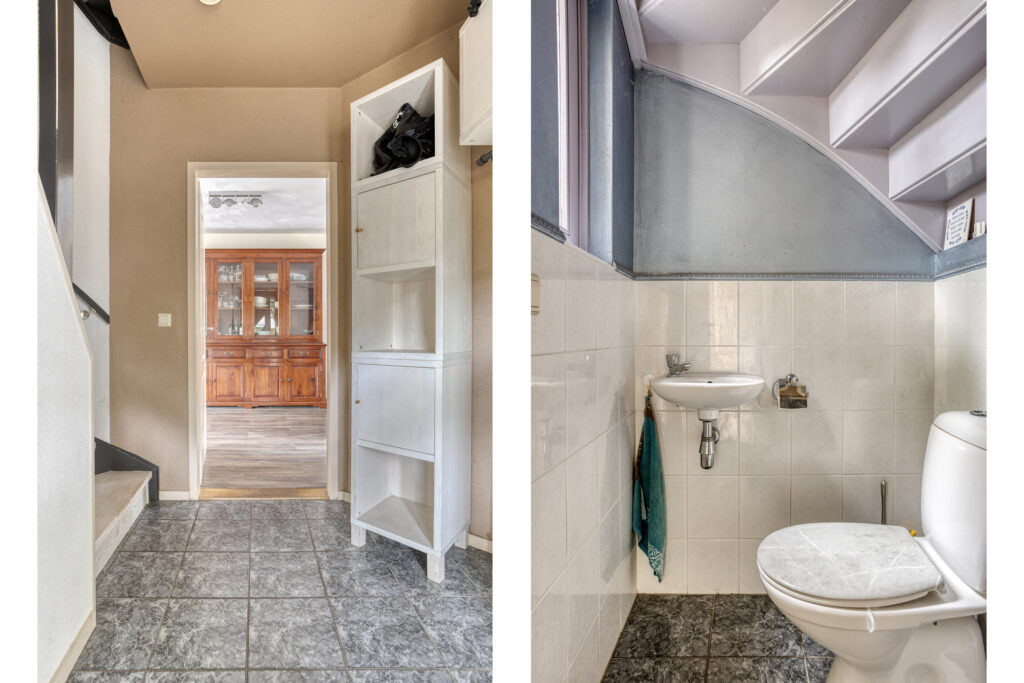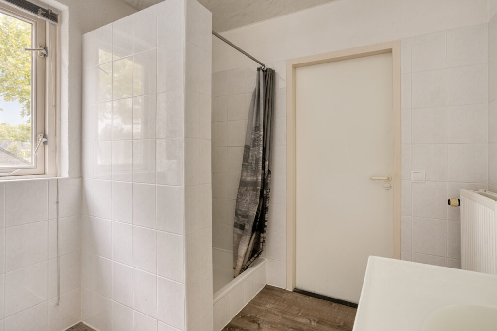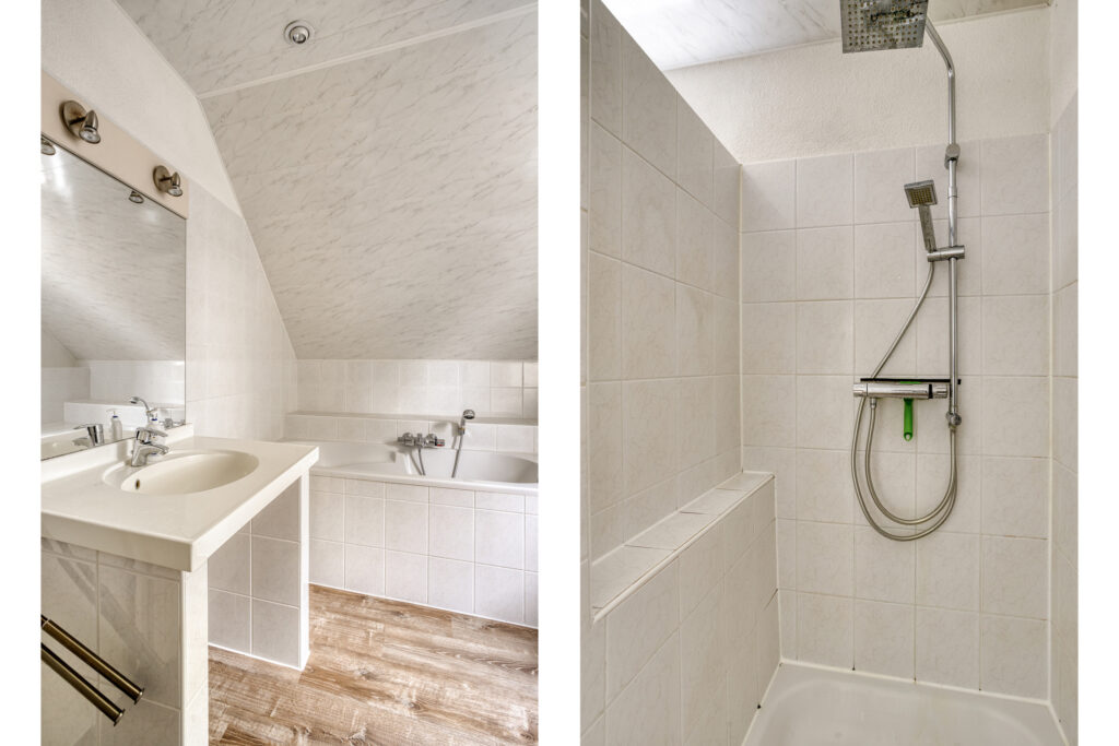 – Geheel betegelde badkamer voorzien van een douche met regen- en handdouche, tweede toilet, wastafel in meubel en ligbad.