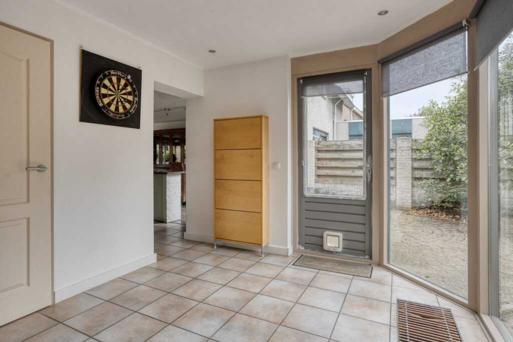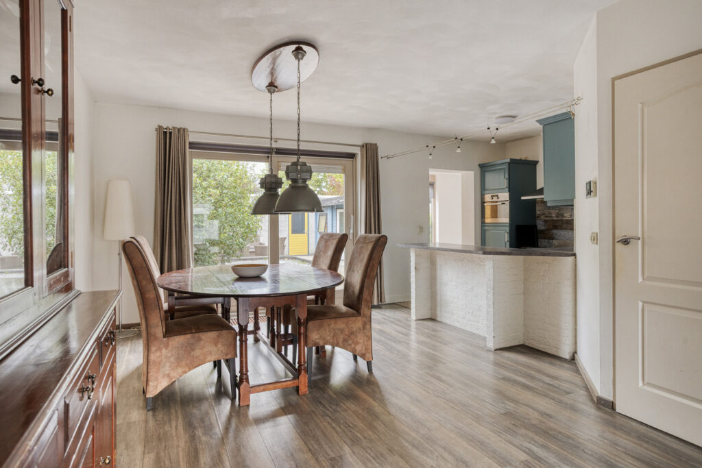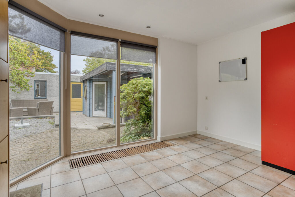 Overdekt zij-entree/hal met toegang tot de trapopgang naar de eerste verdieping, meterkast en de toiletruimte voorzien van staand toilet met fonteintje. De royale woonkamer heeft door zijn omvang en vele raampartijen veel natuurlijk lichtinval. De open (eet)keuken is gelegen aan de achterzijde en biedt toegang tot de tuinkamer evenals de tuin middels een schuifpui. De open keuken is voorzien van een hoekopstelling met bar en diverse onder- en bovenkasten. Aan inbouwapparatuur is aanwezig: 5-pits gaskookplaat, RVS afzuigkap, koelkast, vaatwasser en een oven. Via een open doorgang is de tuinkamer te bereiken met toegang tot de bijkeuken. De ruimtelijke tuinkamer heeft veel lichtval door de grote raampartijen en via een loopdeur is de tuin/terras bereikbaar. De bijkeuken is voorzien van de aansluiting voor de was- en droogapparatuur en dient tevens als opstelplaats voor de CV-combiketel.