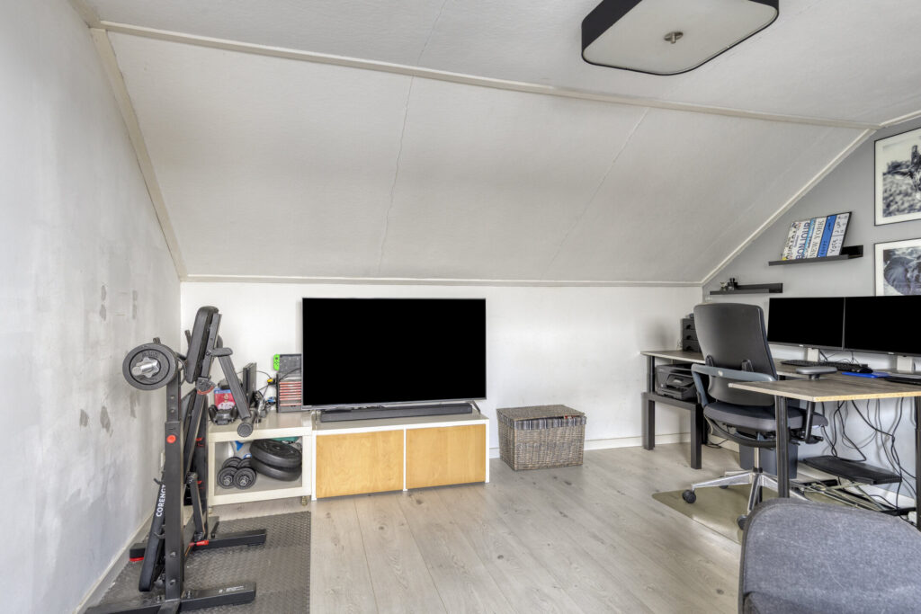 Ruime voorzolder met wasruimte; slaapkamer IV, ruim slaapkamer met kunststof dakkapel en pantry met wasbak.