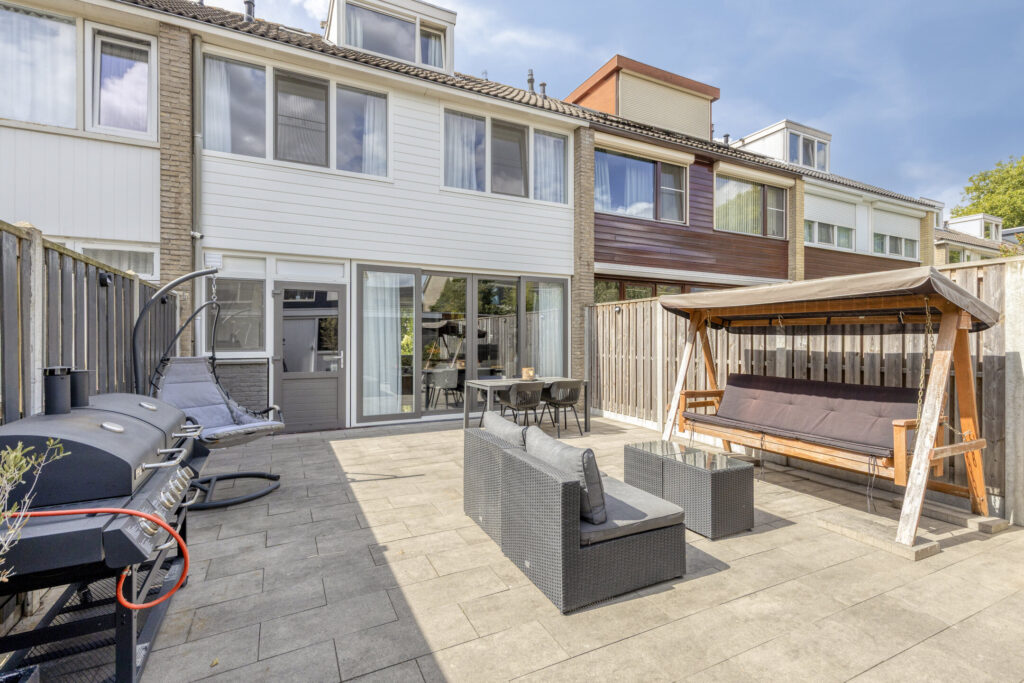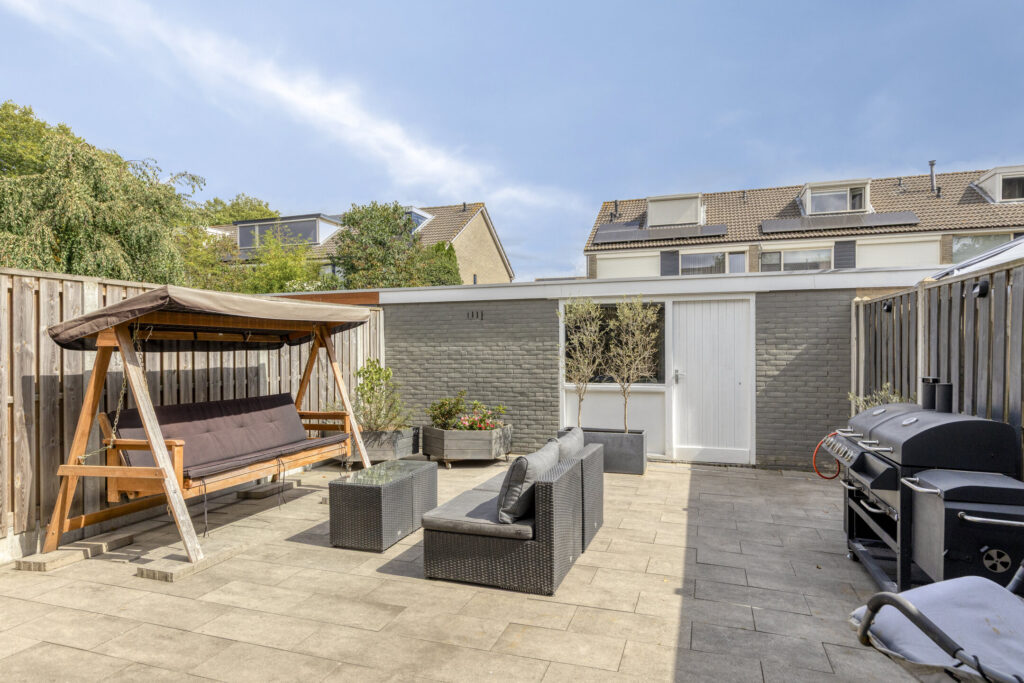 De fijne, privacy biedende achtertuin is gelegen op het oosten en onderhoudsvriendelijk ingericht met o.a. sierbestrating en degelijke erfafscheiding. Verder is de tuin voorzien van een waterkraan en buitenverlichting. Achterin de tuin is over de volle breedte van het perceel een stenen berging gelegen met toegang tot de achterom. De voortuin is volledig bestraat en omheind met vaste beplanting. Tevens is er een buitenkraan aanwezig.