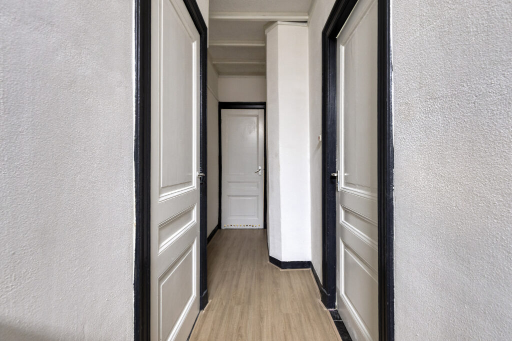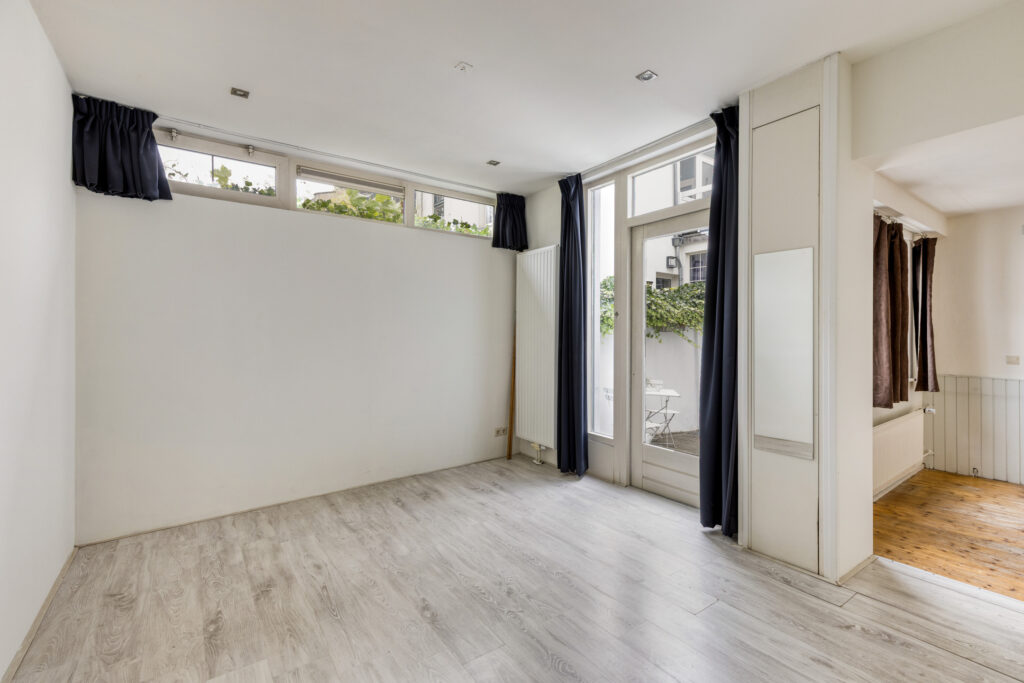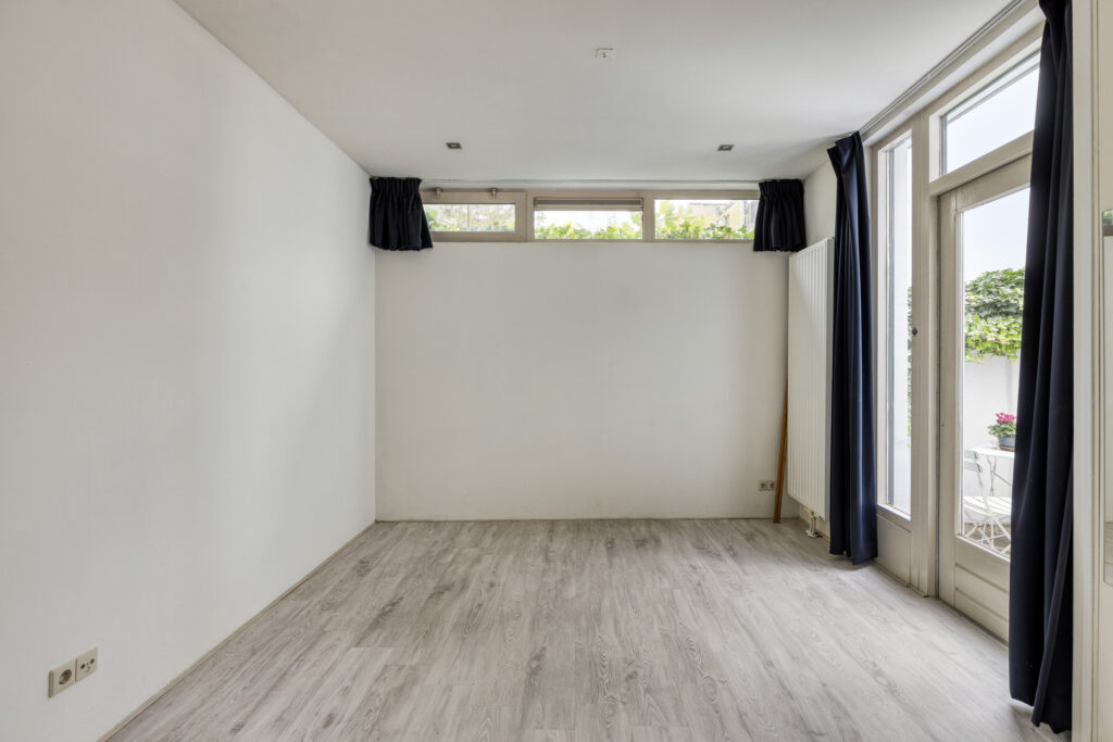 Slaapkamer I gelegen aan de voorzijde van de woning met een plafondhoogte van ruim 3 meter, schouw en inbouwkasten. Eenvoudige keuken in een rechte opstelling voorzien van onder- en bovenkasten, 4-pits gaskookplaat, afzuigkap, combi-oven en spoelbak. Slaapkamer II / woonkamer vanuit de keuken bereikbaar, ruime woonkamer met aansluitend slaapkamer voorzien van laminaatvloer, schouw, schuifdeuren en vaste kasten.