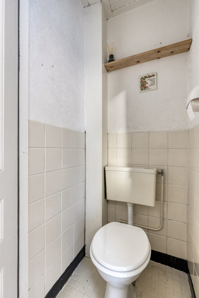 Hal/entree met toegang tot de meterkast, verdiepte kelder (loopt diep door onder de woning), deels betegelde toiletruimte met staand closet.