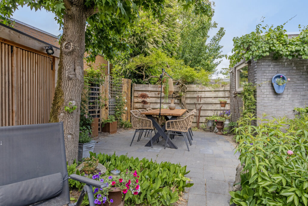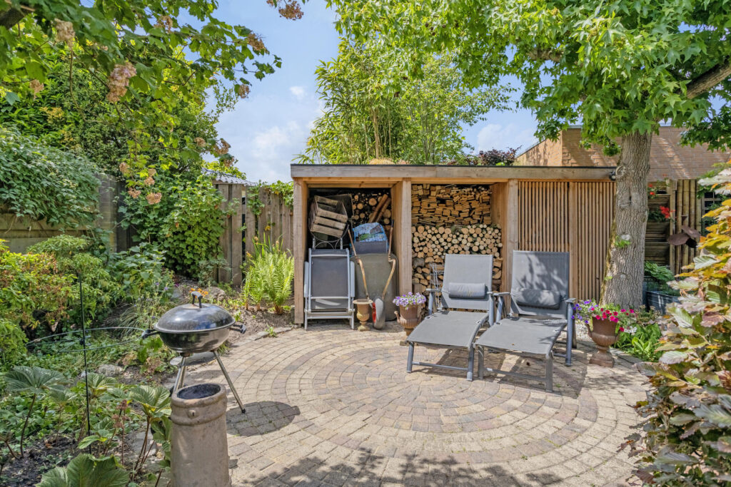 Vanuit het comfort van dit heerlijke woonhuis is het gehele jaar door ook volop van de verzorgde tuin met optimale privacy te genieten. De tuin is speels ingericht met sierbestrating, diverse terrassen en veel vast groen. Achterin de tuin is een fraaie opslag in Douglashout gerealiseerd met verlichting. Verder is de tuin voorzien van diverse stopcontacten, buitenverlichting, degelijke erfafscheiding, waterkraan en een containerombouw (in Douglashout). Vanuit de tuin is tevens de stenen berging te bereiken met doorloop naar de multifunctionele ruimte. De voortuin is ingericht met veel vaste beplanting en biedt tevens plaats aan een royale oprit met parkeerplaats voor meerdere auto’s.