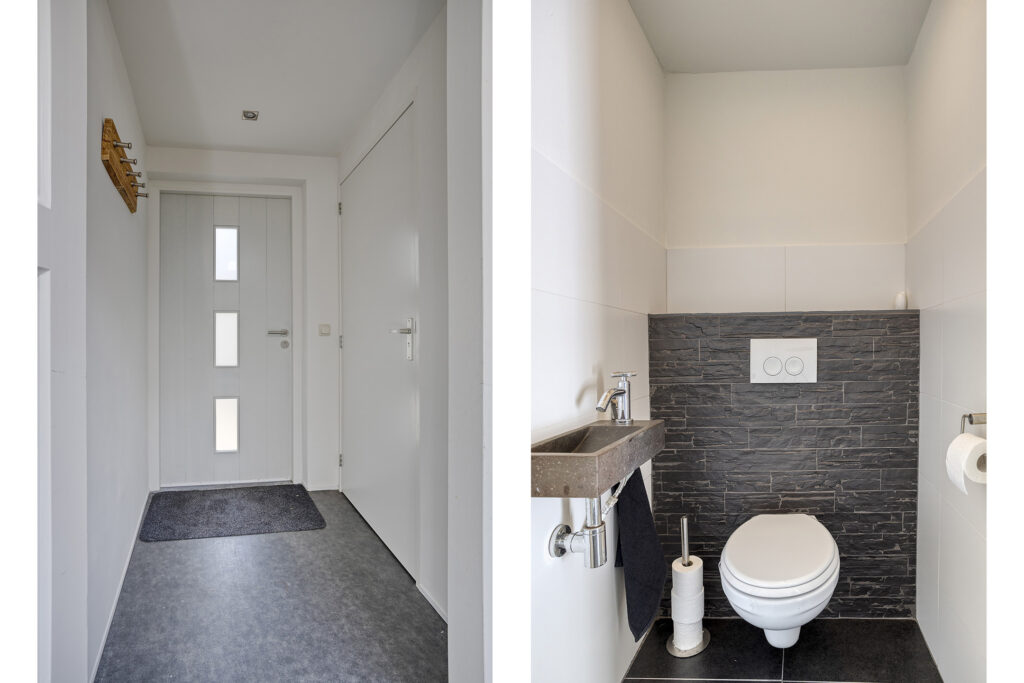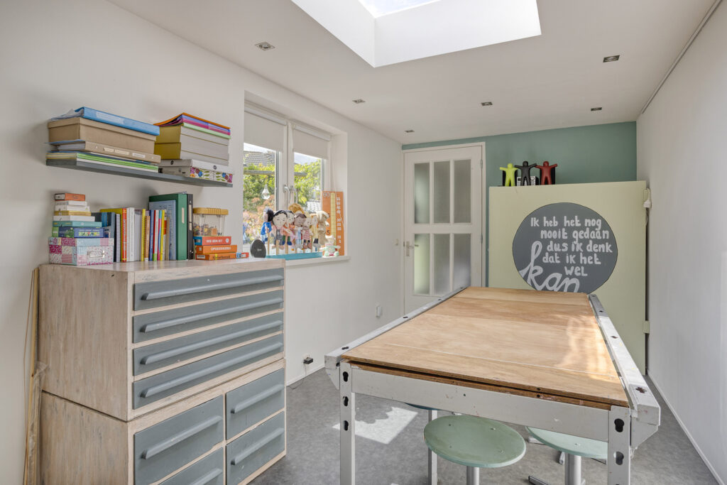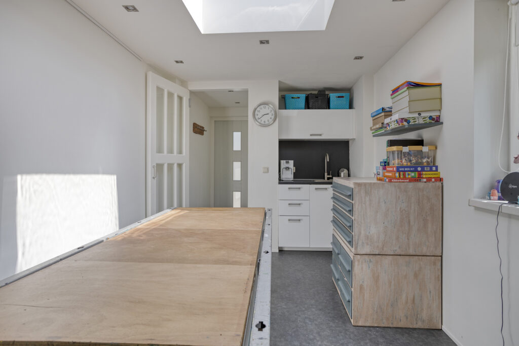 Geïsoleerde, multifunctionele ruimte met apart toilet met fonteintje, ideaal voor bijvoorbeeld een praktijk of kantoor aan huis. Deze ruimte is geïsoleerd en beschikt over een eigen voordeur (vanuit oprit) met entree. De multifunctionele ruimte is voorzien van een pantry, inbouwpots, 2x kunststof draai/kiep raam evenals een lichtkoepel. Via een loopdeur is er doorgang naar de berging.