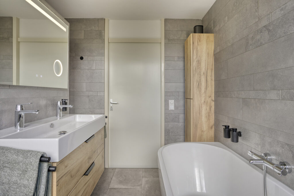 – Moderne, geheel betegelde badkamer (2022), voorzien van een inloopdouche met regen- en handdouche, tweede toilet, wastafelmeubel met dubbele kraan, ligbad met handdouche, wandkast en designradiator. De badkamer is voorzien van een dakkapel met draai/kiep raam. Achter de schuine kant is er nog extra bergruimte aanwezig.