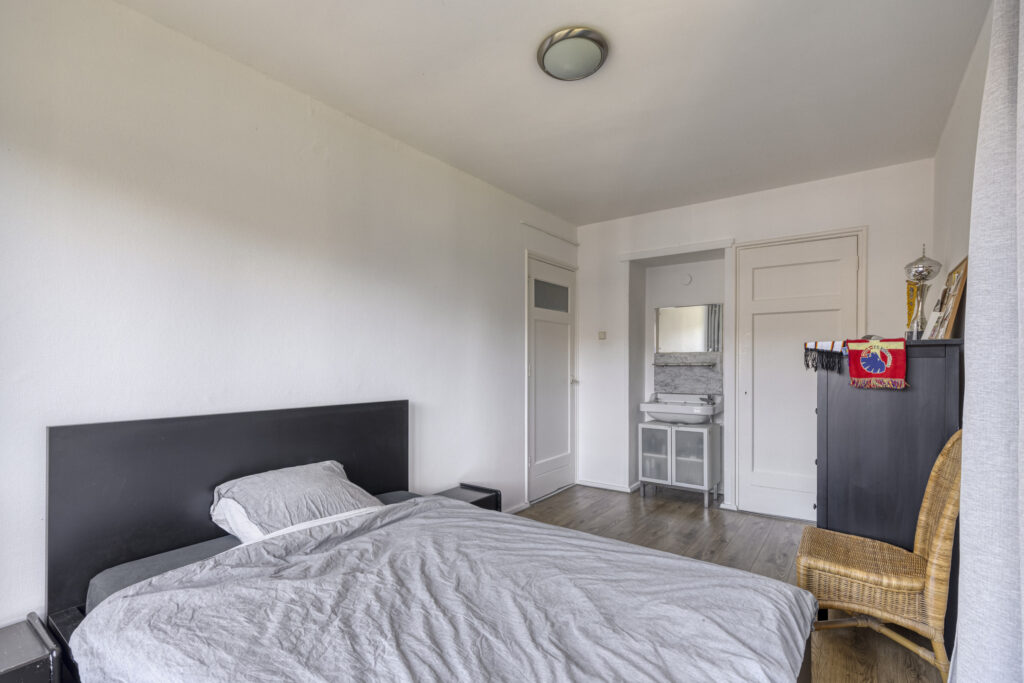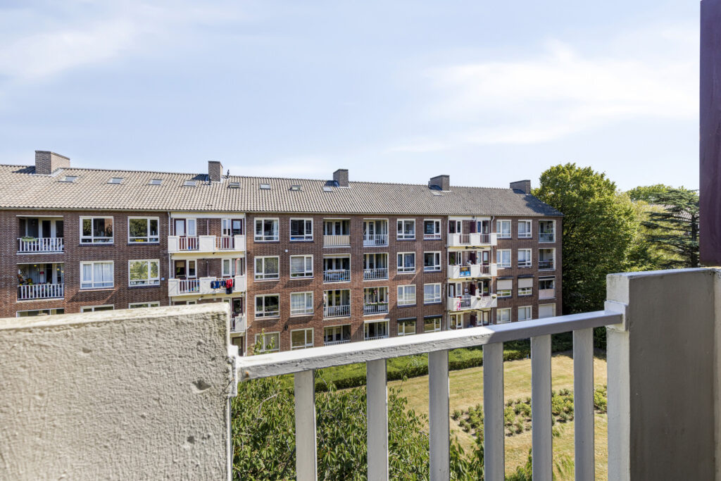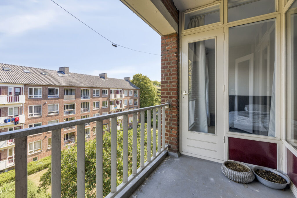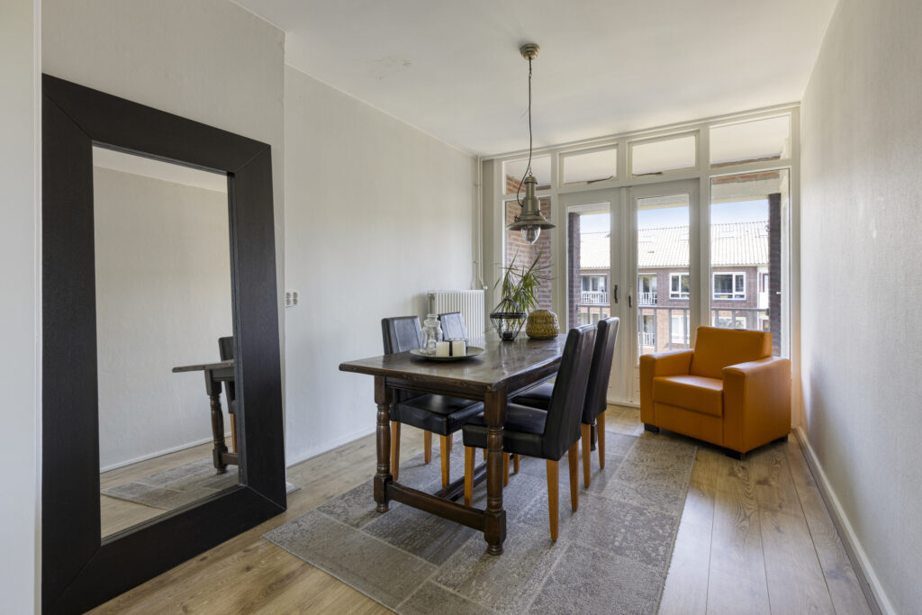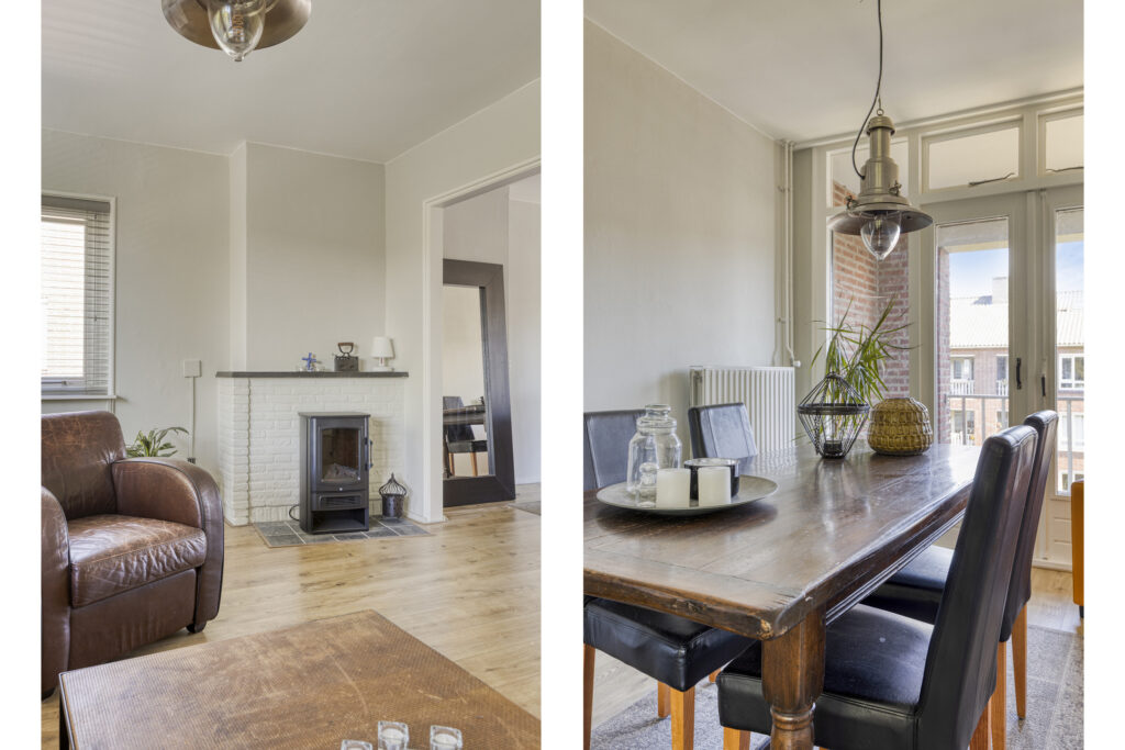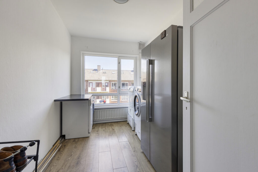 Ruime hal met entree en toegang tot alle vertrekken , intercom, vlizotrap naar zolder en vaste kast; grote en lichte living met originele schouw (afm. ca. 5.73 x 4.25m) en afgewerkt met een laminaatvloer, eetkamer (afm. ca. 3.88 x 2.93m) met openslaande deuren naar het balkon/loggia aan de achterzijde (afm. ca. 1.64 x 2.88m); keuken (afm. ca. 1.86 x 2.44m) met deur naar het 2e balkon (afm. ca. 0.81 x 2.29m) en voorzien van een recht keukenblok met spoelbak en boven- en onderkasten, een gasfornuis met heteluchtoven en afzuigkap; badkamer (afm. ca. 1.40 x 1.20m) met douche en wastafelmeubel; aparte deels betegelde toiletruimte; slaapkamer I (afm. ca. 4.63 x 2.70m) voorzien van laminaatvloer met vaste kast, wastafel en deur naar balkon/loggia (afm. ca. 4.63 x 2.70m); slaapkamer II (afm. ca. 3.21 x 3.52m) voorzien van laminaatvloer; slaapkamer III/bijkeuken (afm. ca. 3.63 x 2.29m) met wastafel en aansluiting voor de was- en droogapparatuur.