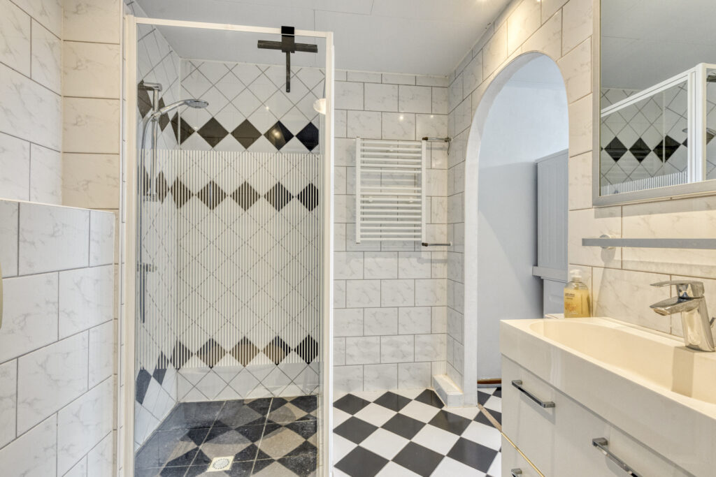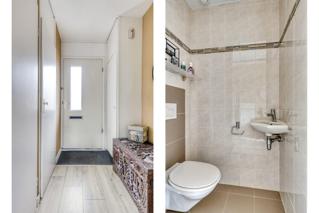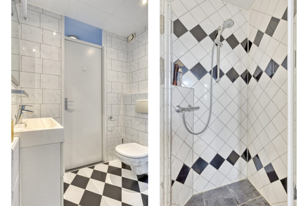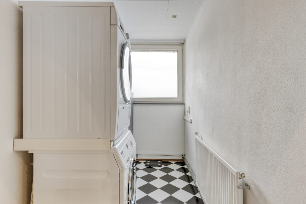– Badkamer, volledig betegeld en uitgevoerd met een douchecabine, zwevend closet en een wastafel in meubel. In het verlengde van de badkamer is de wasruimte gelegen met tevens veel bergruimte.