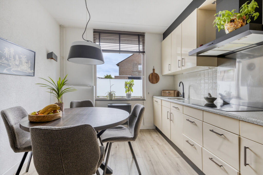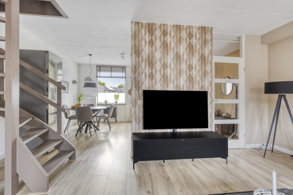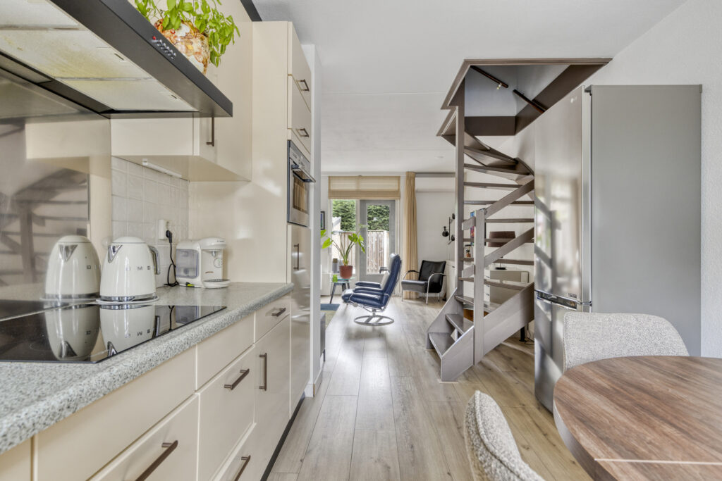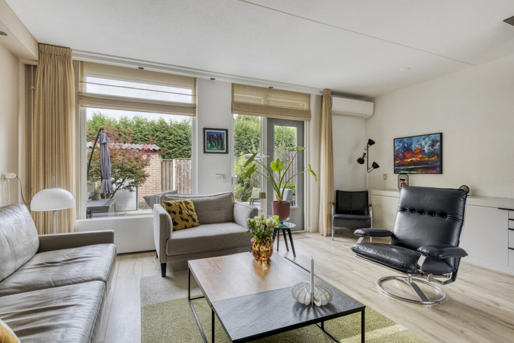 Entree/hal, met de moderne meterkast, het toilet, bergkast en toegang tot de woonkamer. Het toilet en volledig betegeld en voorzien van een hangcloset en een fonteintje. De ruime woonkamer, met laminaatvloer, stucwerk wandafwerking en airconditioning heeft veel natuurlijk lichtinval vanwege de grote raampartijen. Via een loopdeur is de tuin te bereiken en via een open trapopgang is er toegang tot de eerste verdieping. De open keuken is gelegen aan de voorzijde en uitgevoerd met een keukenblok in rechte opstelling met diverse boven- en onderkasten. Aan inbouwapparatuur is aanwezig een koelkast, een inductie kookplaat, een afzuigkap en een vaatwasser.