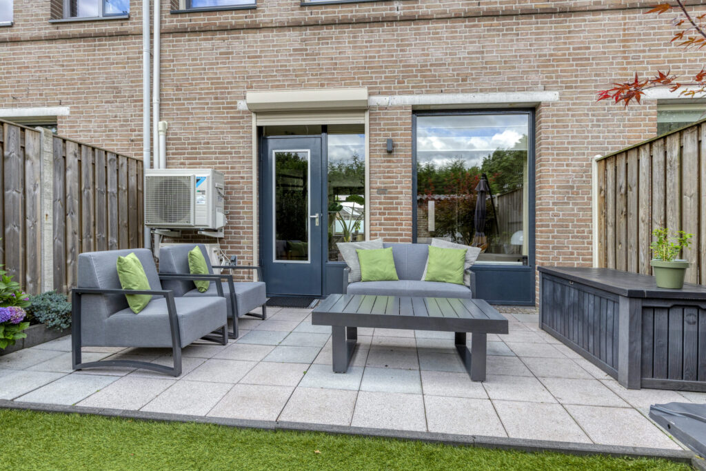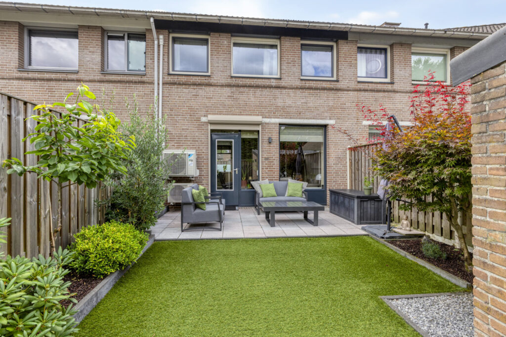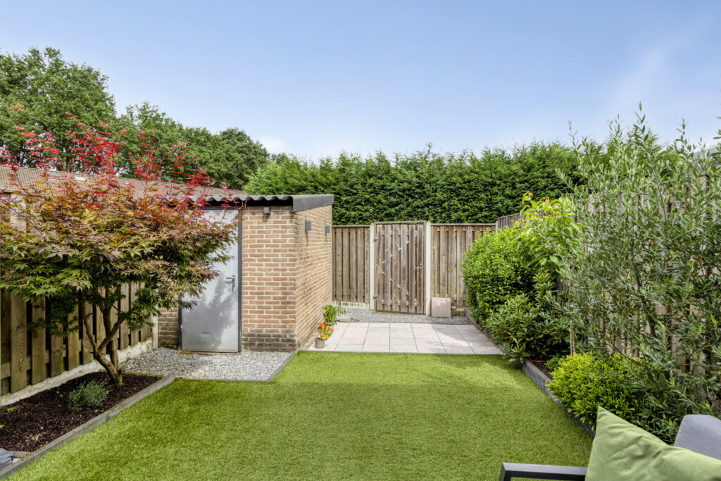 De achtertuin is ca. 10m diep en is gelegen op het noordwesten. De tuin is verzorgd ingericht met grote terrastegels, kunstgras gazon, borders en vaste beplanting en degelijke erfafscheiding. Middels een poort is er toegang tot de achterom. De degelijke stenen berging is uitgevoerd met een betonvloer en elektra.