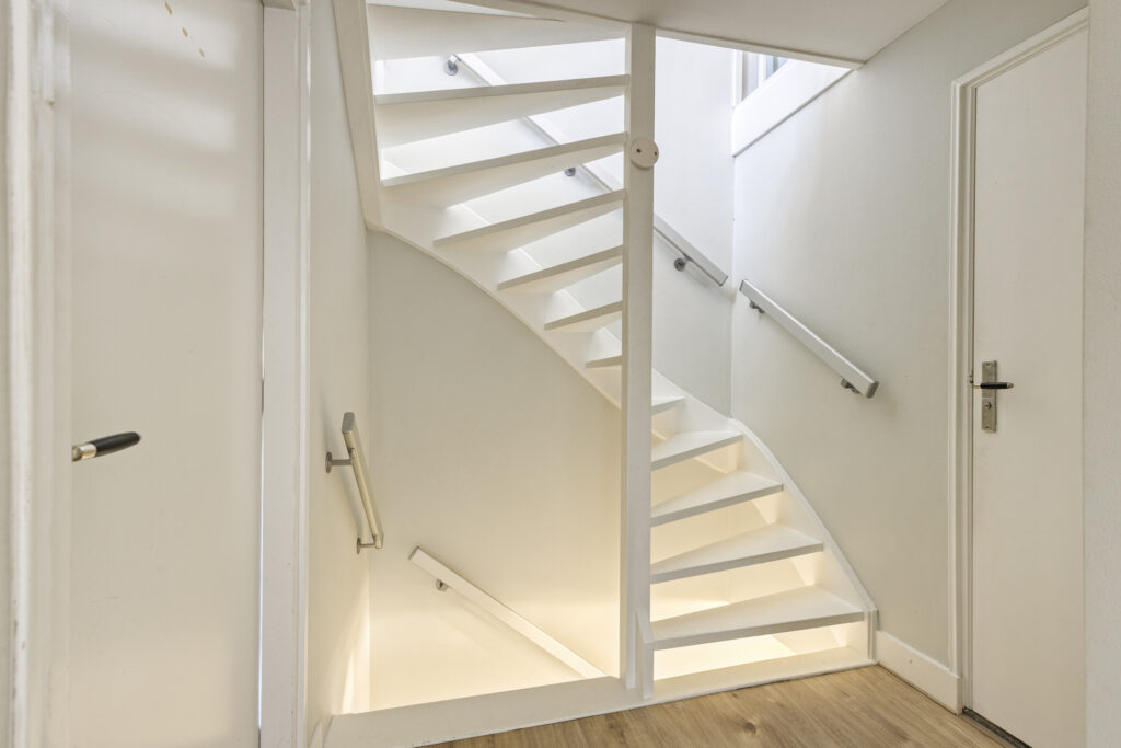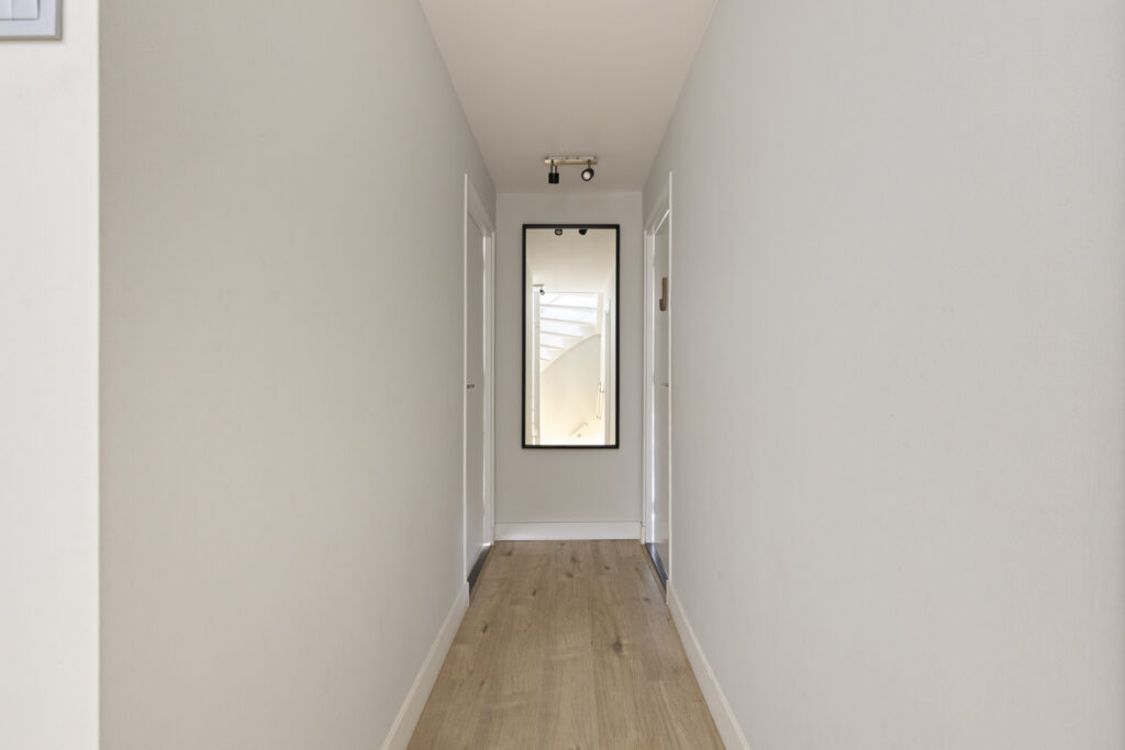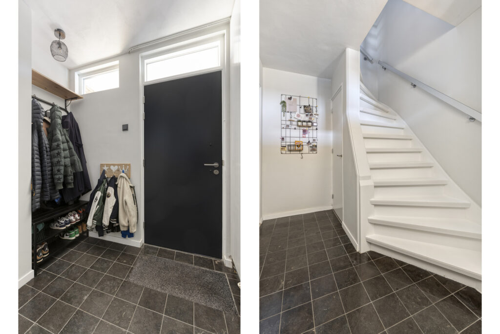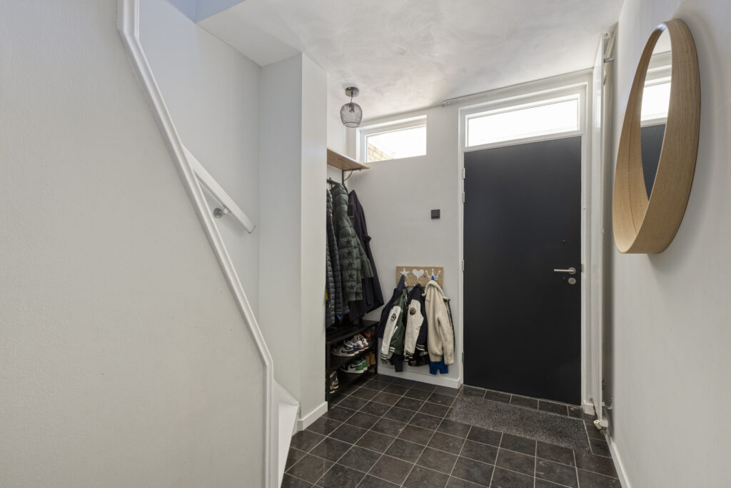 Overdekte entree met toegang tot de riante hal. Door het verplaatsen van het toilet naar de bijkeuken is hier een extra ruimtelijk gevoel ontstaan. In de hal bevindt zich een diepe kelderkast met vernieuwde meterkast (2024) en veel opbergruimte, een garderobehoek en de trapopgang naar de eerste verdieping. Op de vloer ligt een donkere natuursteen en de wanden zijn glad gestuct.