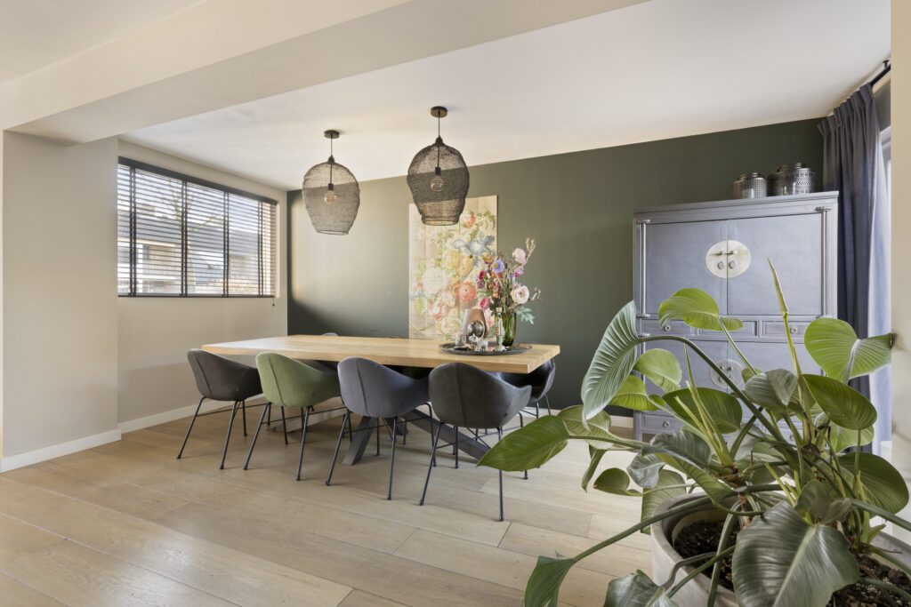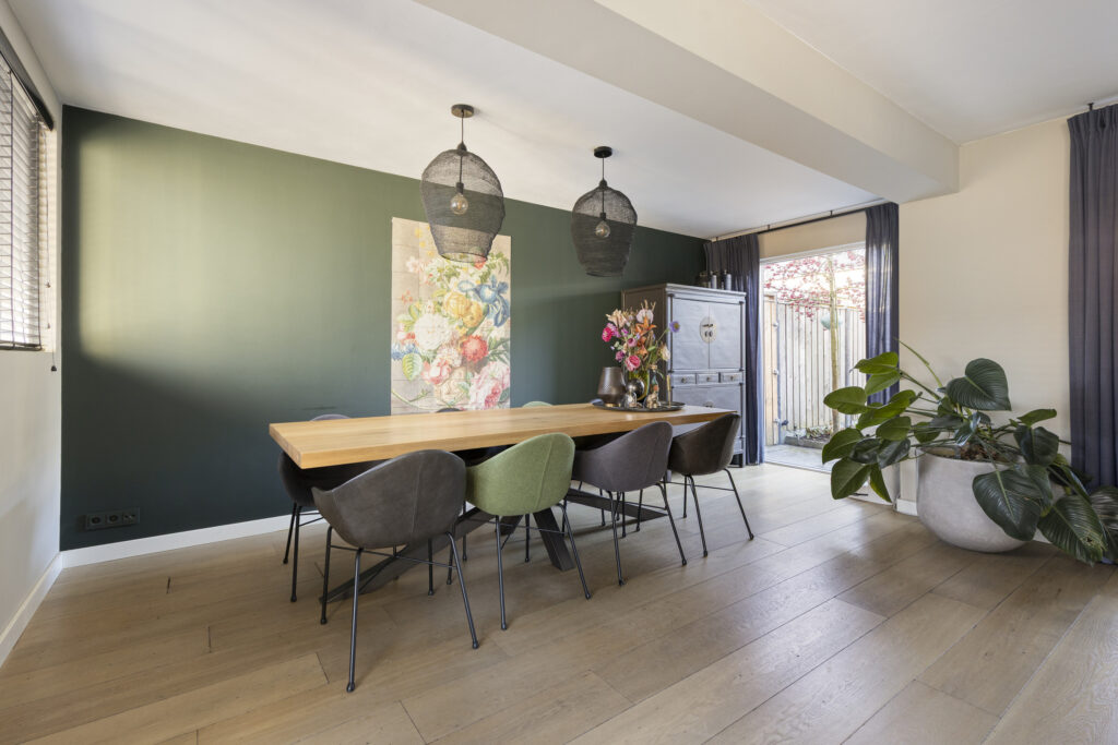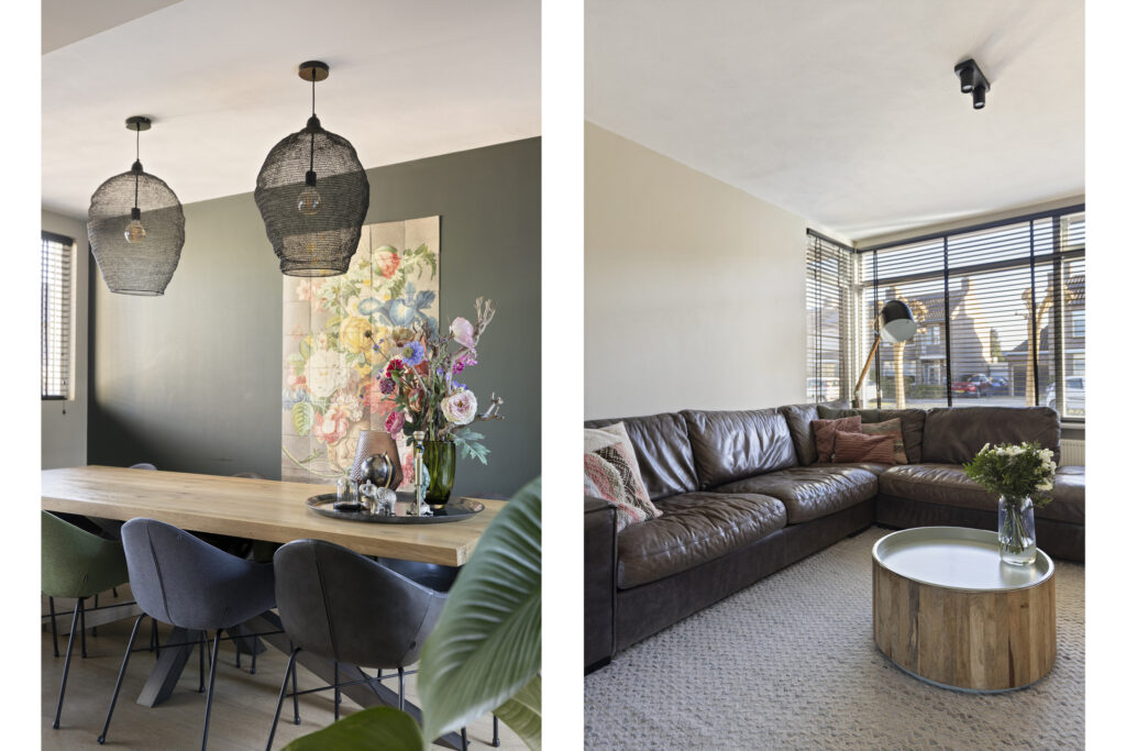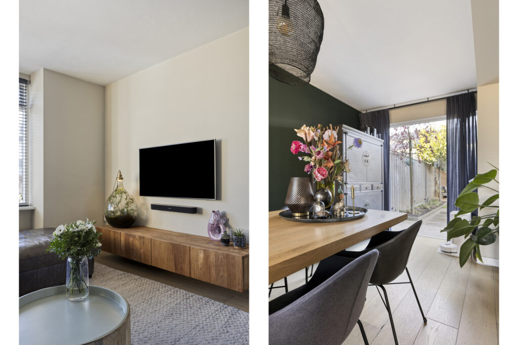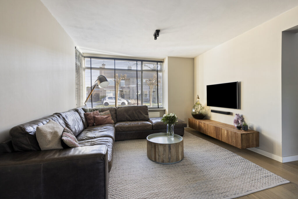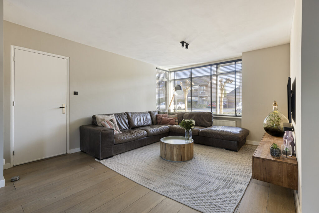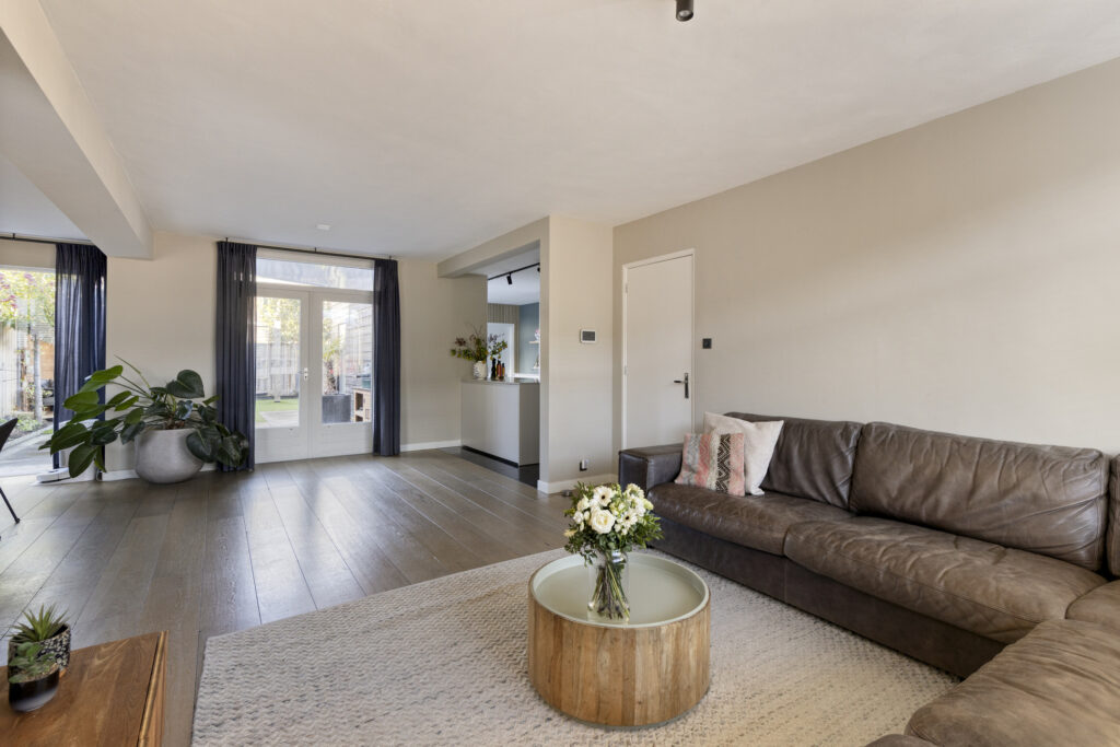 Vanuit de hal bereikt u de lichte, uitgebouwde living. Doordat de oorspronkelijke garage bij de living is betrokken, is een royale leefruimte ontstaan met veel lichtinval en een speelse indeling. Er zijn openslaande deuren aanwezig die toegang geven tot de achtertuin. De living is eenvoudig in te delen met een ruime zithoek aan de voorzijde van de woning. In de voormalige garage is een mooie eetruimte gecreëerd met plaats voor een 8-persoonseettafel en uitzicht op de achtertuin. Op de vloer ligt een hoogwaardige lamelparketvloer met vloerverwarming en de wanden zijn strak gestuct.
