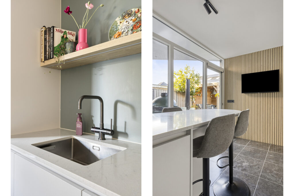 In het verlengde van het kookeiland, bij de grote glazen pui met loopdeur naar de achtertuin, is een gezellige eetbar gecreëerd met zicht op de tuin. De vloer is afgewerkt met donkere natuursteen en voorzien van vloerverwarming.