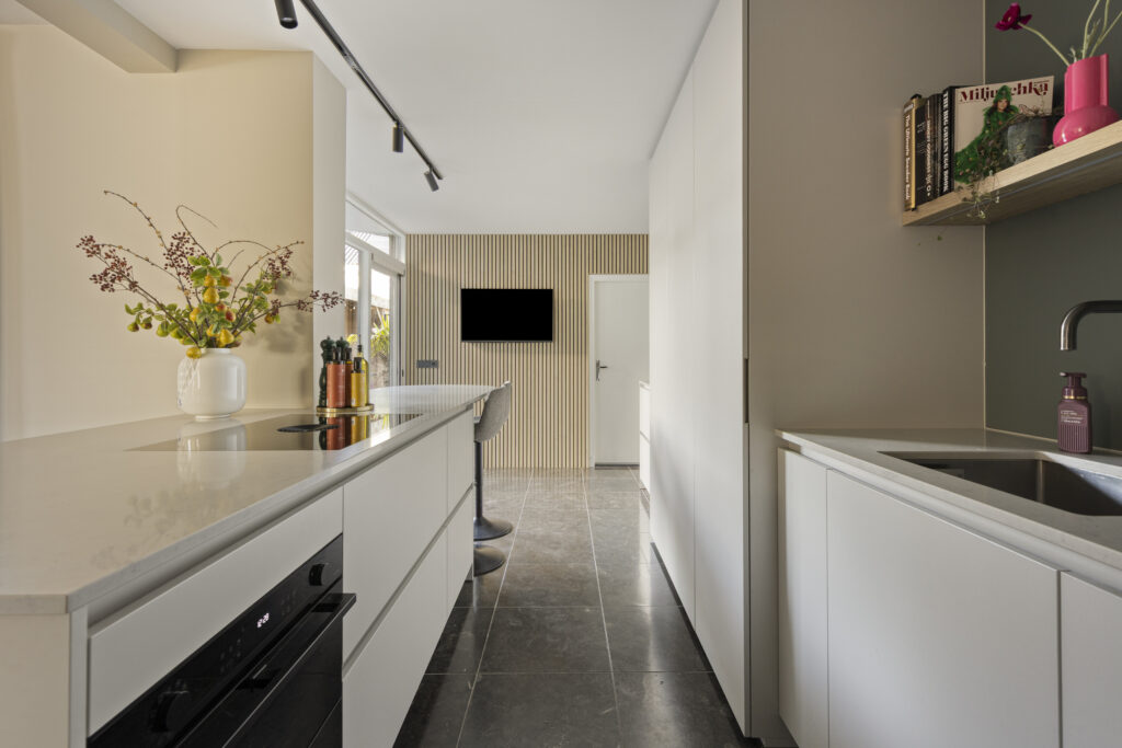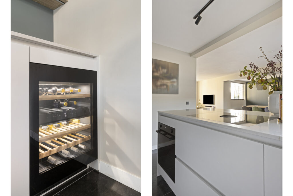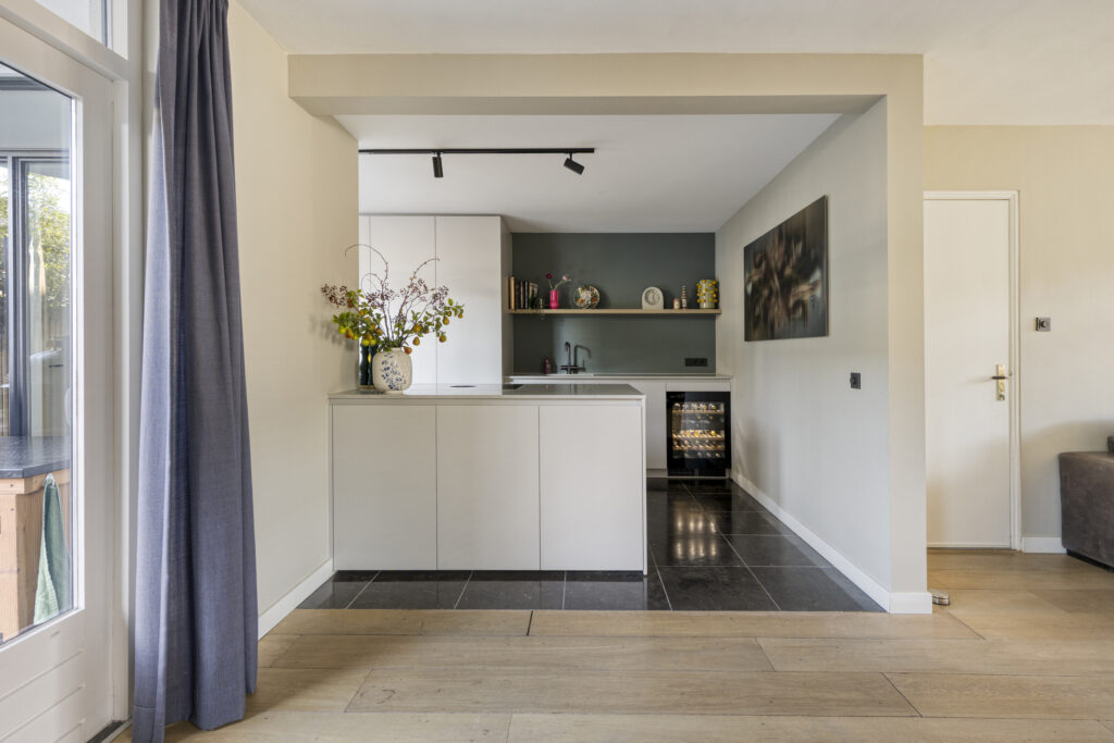 Vanuit de living is de prachtige leefkeuken (2024) bereikbaar. Deze op maat gemaakte luxe keuken met kookeiland is voorzien van diverse inbouwapparatuur, waaronder een wijnklimaatkast, koelkast, vaatwasser, inductiekookplaat met geïntegreerde afzuiging (Bora), oven en een Selsiuz-kraan (kokend water). Het werkblad is uitgevoerd in composiet. Daarnaast is er volop opbergruimte in kasten en lades.