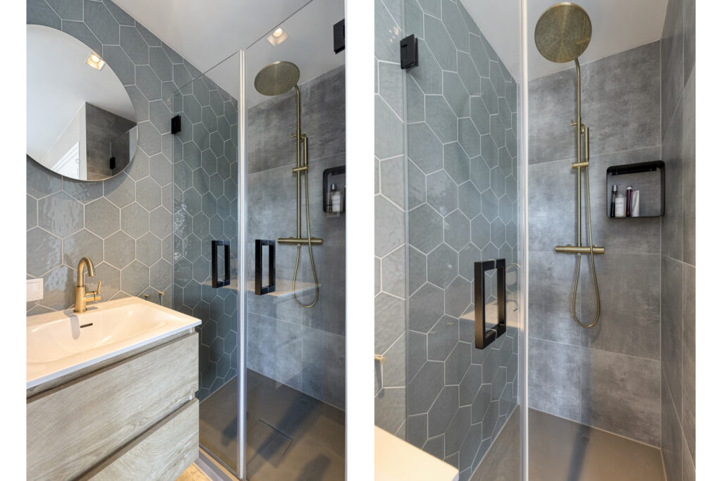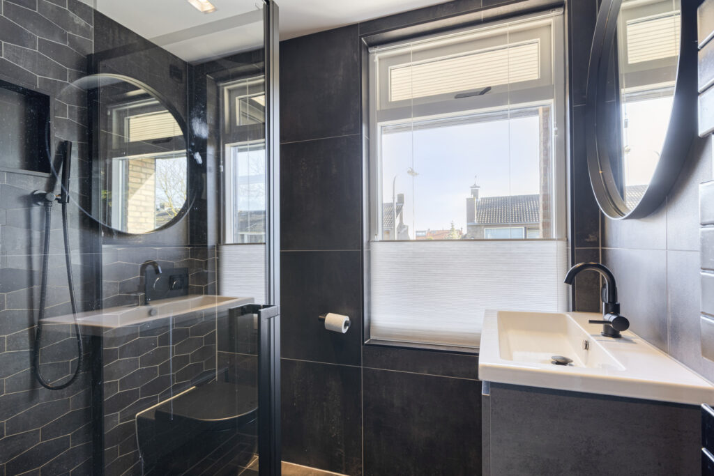 De tweede luxe badkamer (2022) is recent vernieuwd en volledig betegeld in een moderne kleurstelling. Deze badkamer beschikt over een douche, wastafelmeubel, designradiator, hangcloset en mechanische ventilatie.