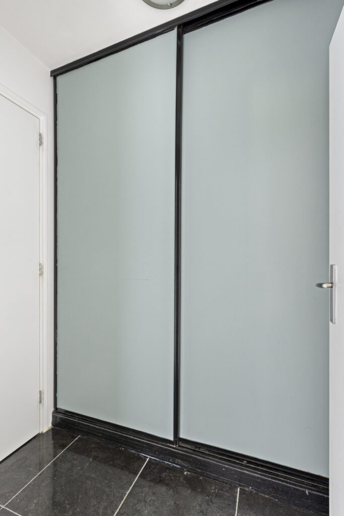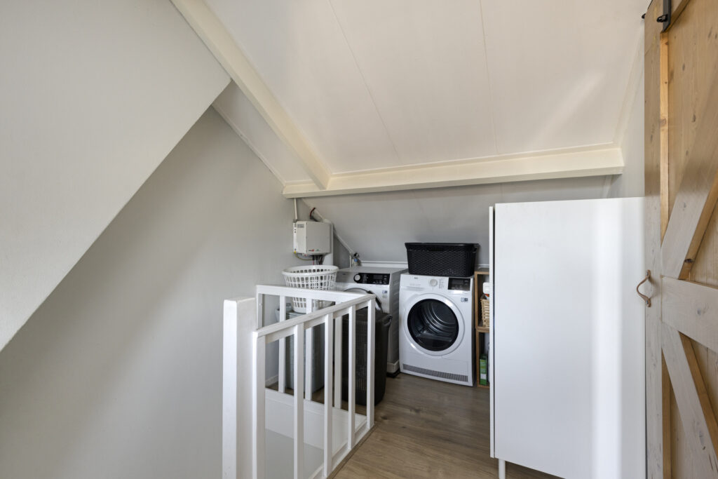 Aangrenzend aan de eetkeuken bevindt zich de bijkeuken. Deze praktische ruimte is voorzien van een wandkast met daarachter de aansluitingen voor de wasapparatuur en de opstelplaats van de cv-installatie (Intergas, 2025). De schuifkast is tevens ideaal als voorraadkast. Ook hier ligt een natuurstenen vloer met vloerverwarming. Vanuit de bijkeuken is de toiletruimte bereikbaar, welke is uitgerust met een hangcloset en een hardstenen fonteintje.