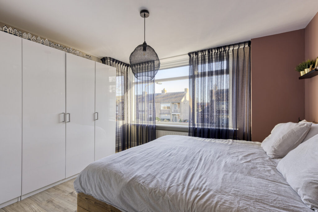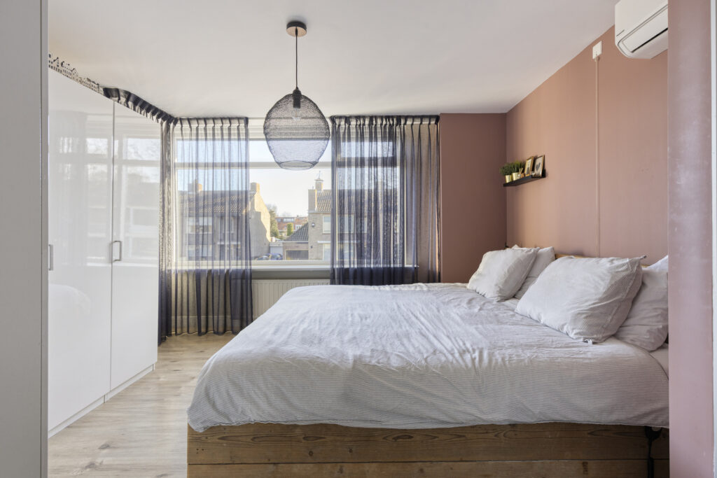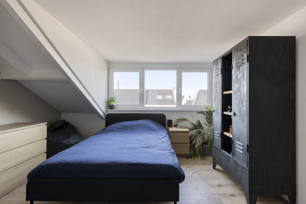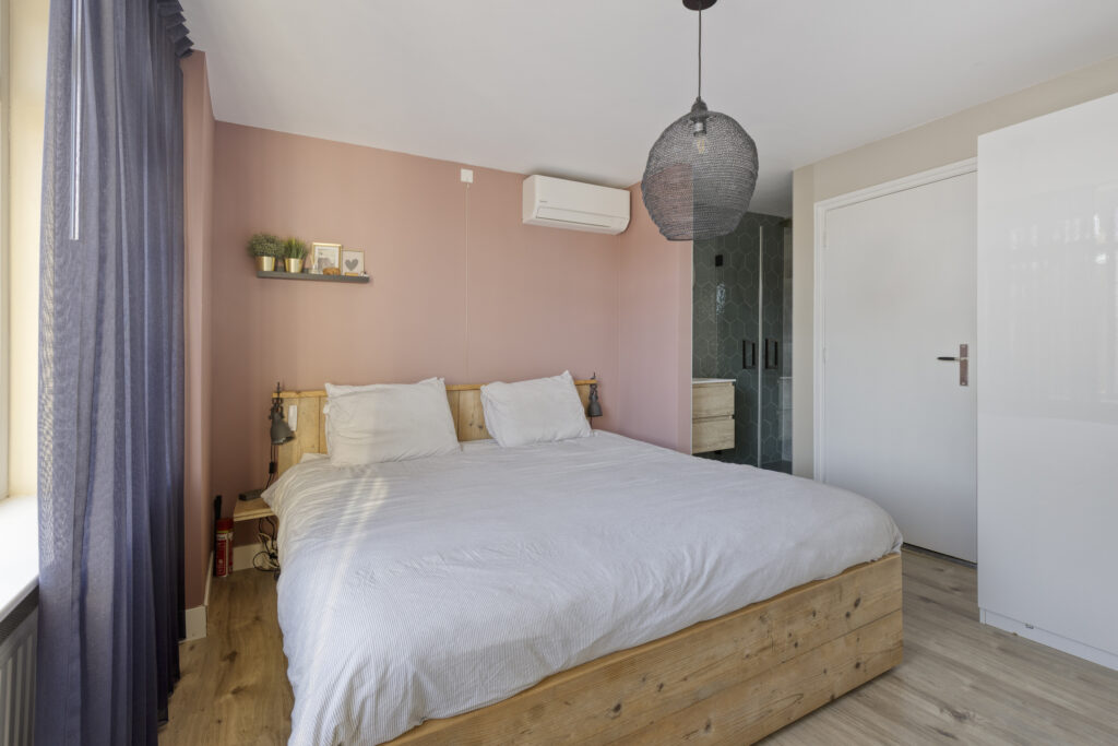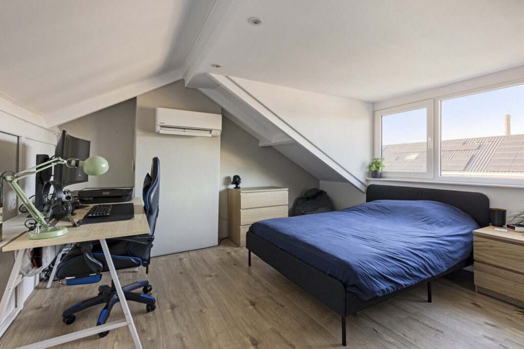 De riante zolderslaapkamer beschikt over airco (verwarmen en koelen) en veel opbergruimte achter de schotten. Op de gehele verdieping ligt laminaat en de wanden zijn gestuct.