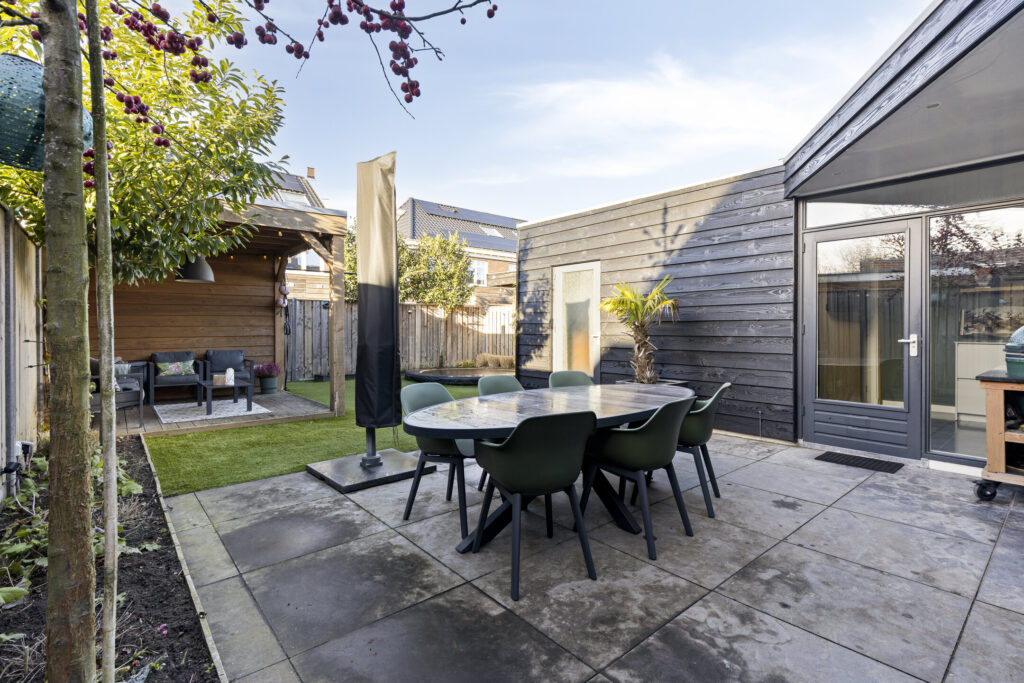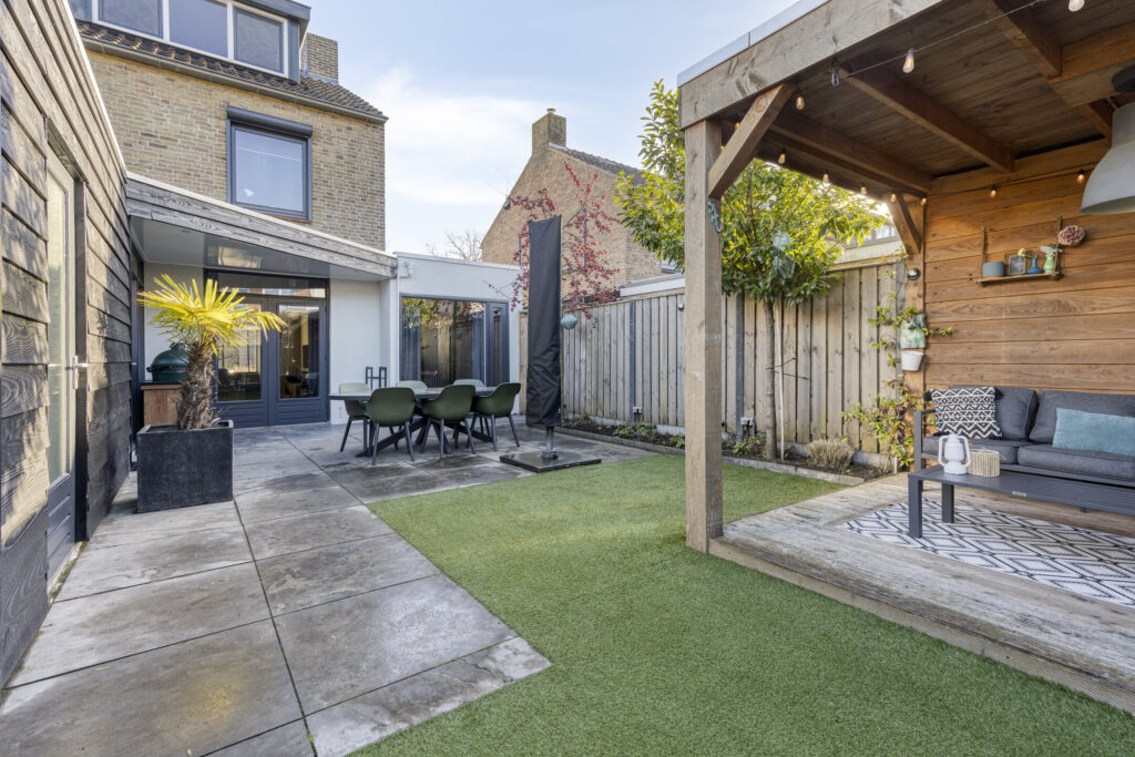 De zonnige achtertuin is gelegen op het westen en is volledig opnieuw aangelegd. De tuin is circa 13 meter diep en 8 meter breed en beschikt over een achterom. Direct aan de woning bevindt zich een overdekt terras met inbouwspots. Achter in de tuin staat een fraaie overkapping met extra berging, voorzien van elektra.