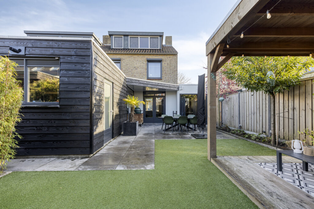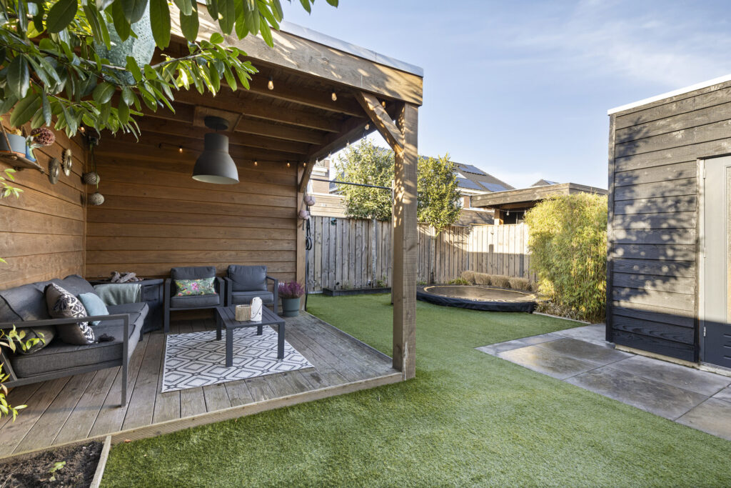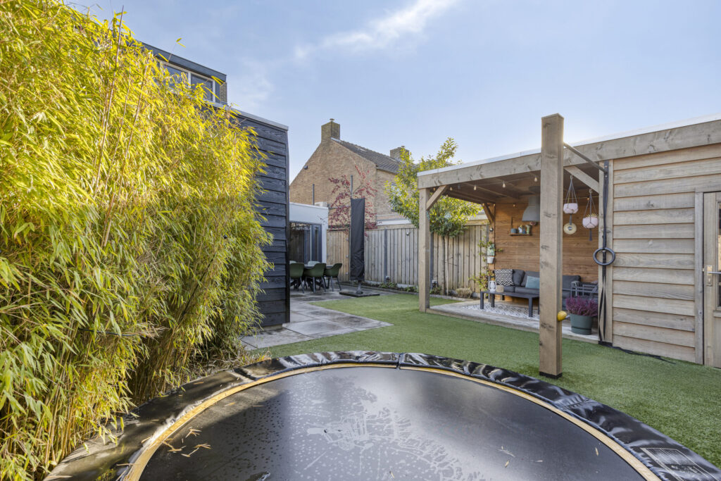 De uitgebouwde keuken en de berging zijn opgetrokken in steen en op fraaie wijze betimmerd met hout. De ruime tweede berging is eveneens voorzien van elektra en veel opbergruimte. In de achtertuin zijn een waterpunt en meerdere elektrapunten aanwezig. Verder beschikt de tuin over een betegeld terras grenzend aan de woning en een gazon met kunstgras. In de borders is volwassen beplanting aangebracht en aan de achterzijde zijn laurierbomen geplaatst, die het hele jaar groen blijven. In deze tuin kunt u in de zomer heerlijk genieten van de zon tot in de late uurtjes.